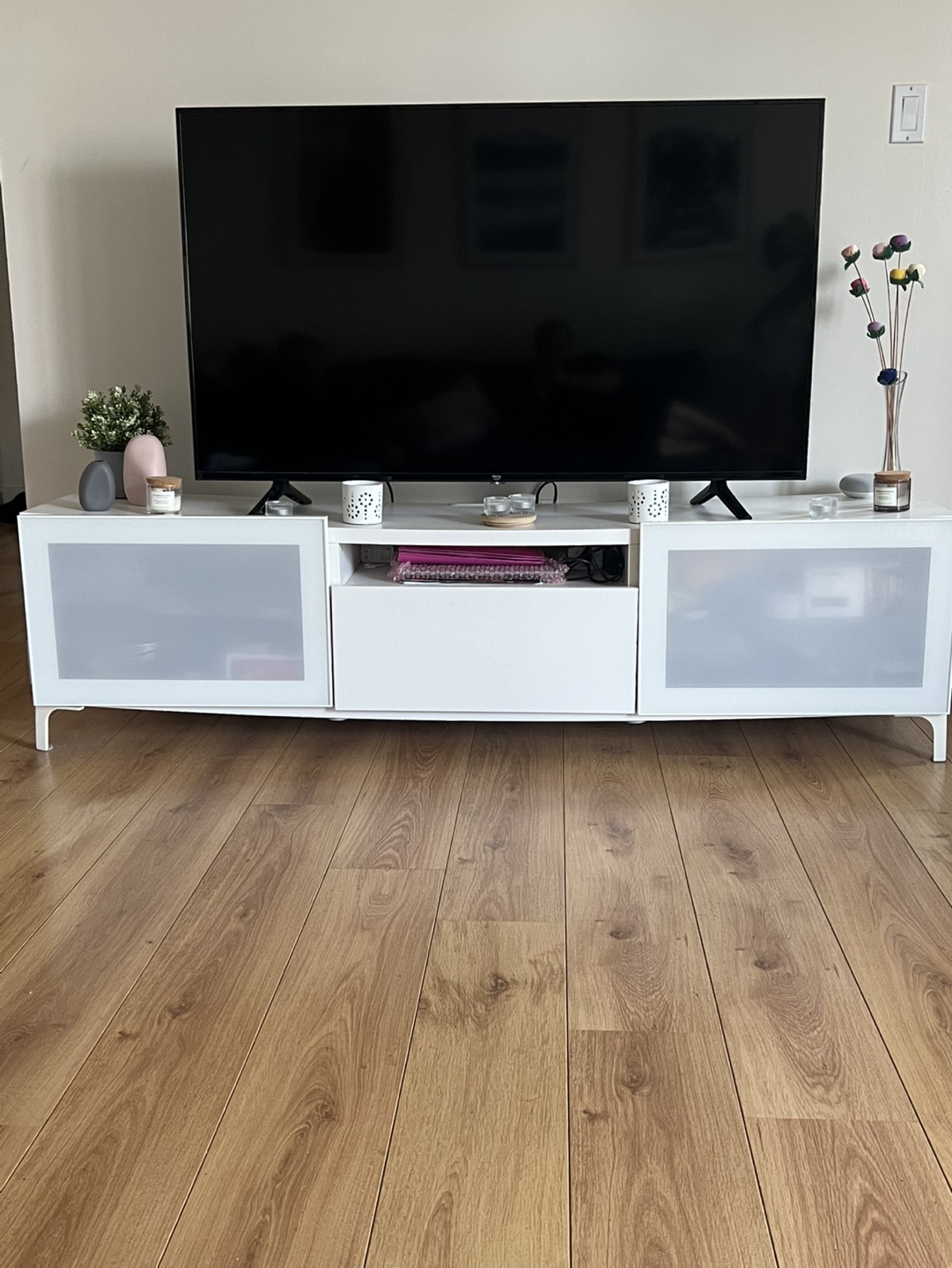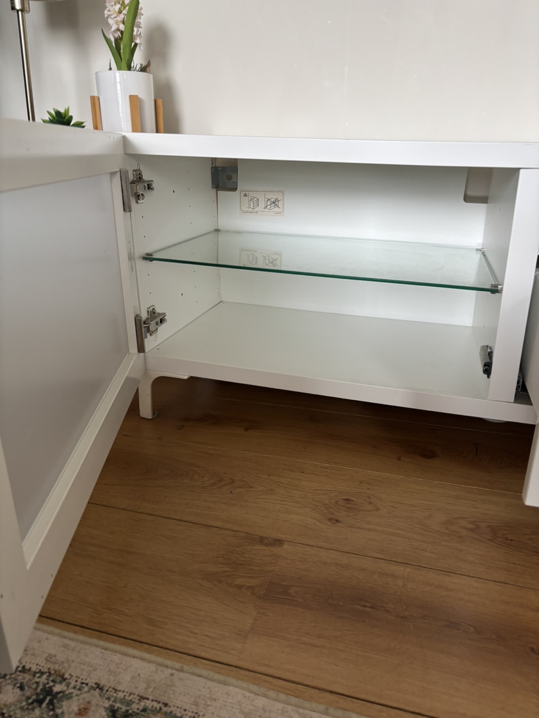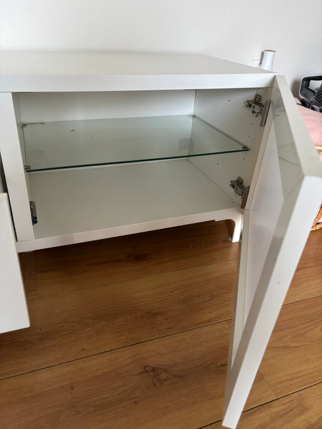 Modern white TV stand. Ample storage space. Two cabinets with glass shelves and one drawer. Curved design. Good condition.