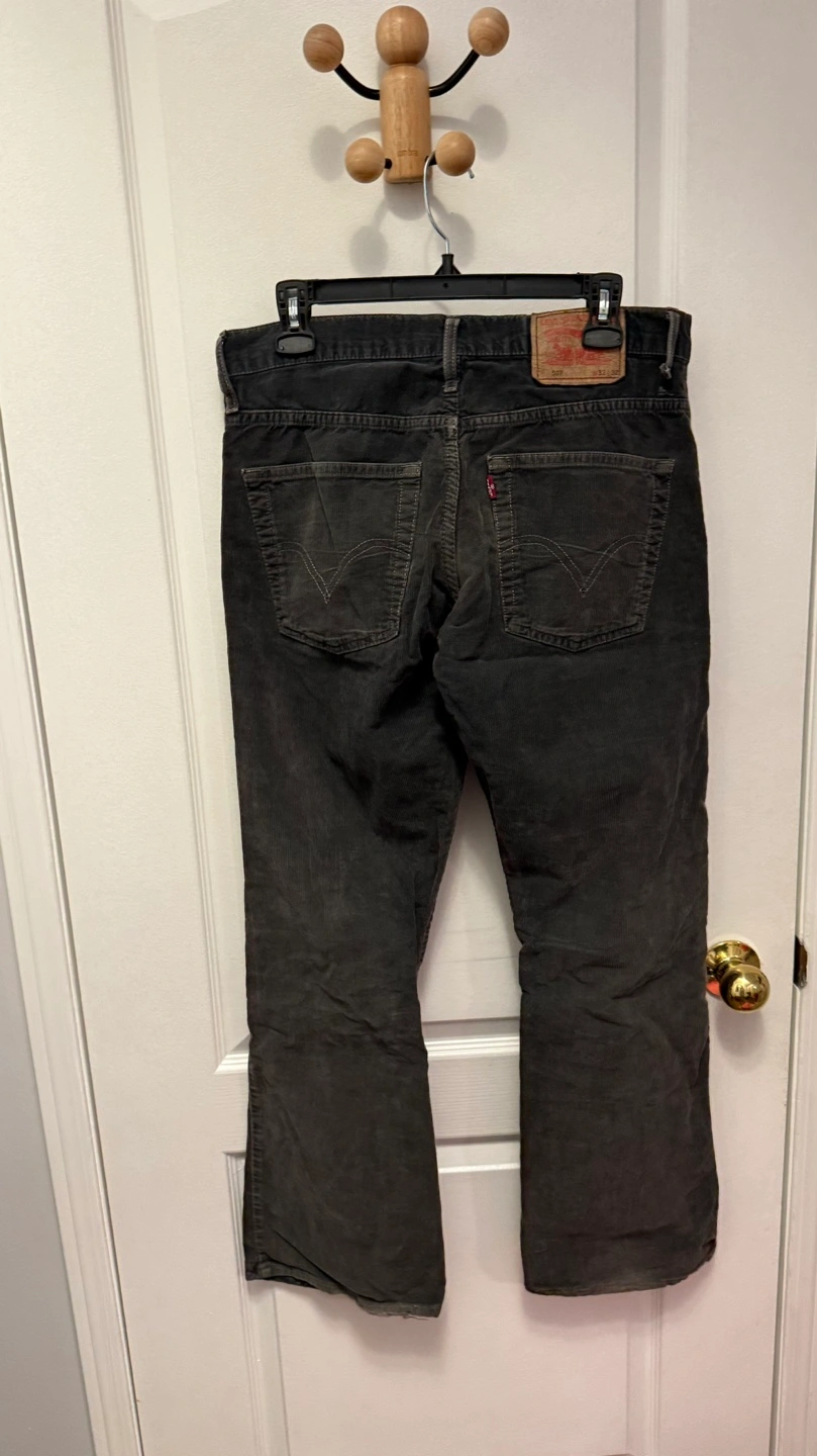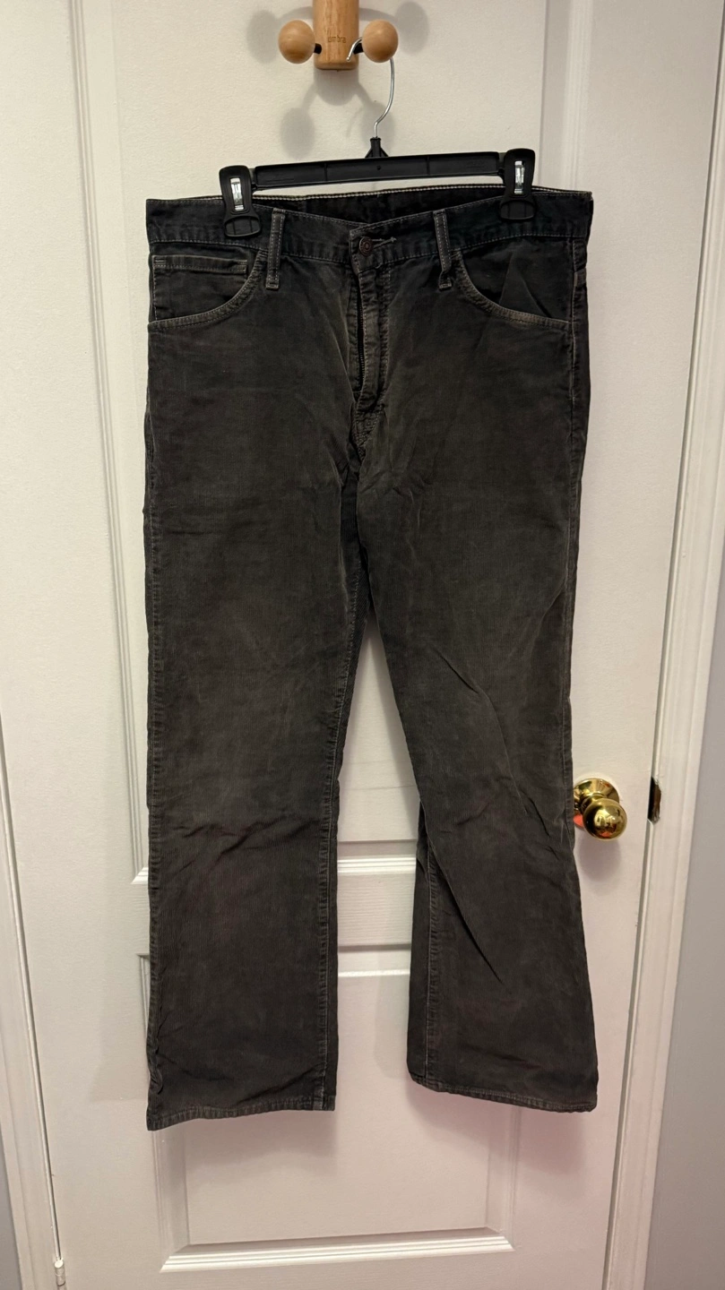 81Men's dark grey corduroy Levi's 507 jeans. Bootcut style. Waist size 32, length 32. Pre-owned. One of the belt loops is ripped but can be fixed. Available for pick up in Vaughan, Barrie and downtown Toronto.