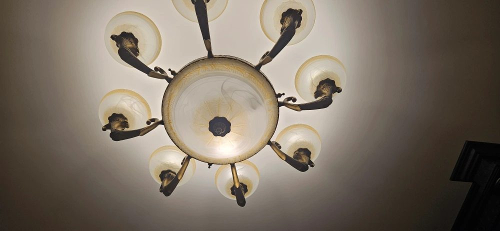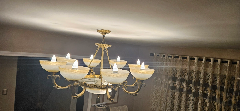 Beautiful chandelier, eight lights. Gold-toned metal frame. Onyx or alabaster-style shades. Adds a touch of elegance to any room. Pre-owned.