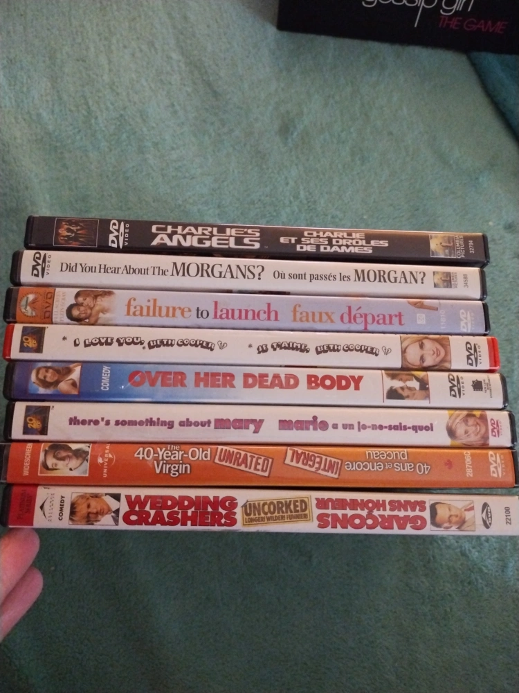 Collection of eight comedies and romantic comedies DVDs. Great for movie night. Titles include: Charlie's Angels, Did You Hear About the Morgans?, Failure to Launch, The 40-Year-Old Virgin, Wedding Crashers, I Love You Beth Cooper, Over Her Dead Body, and There's Something About Mary.