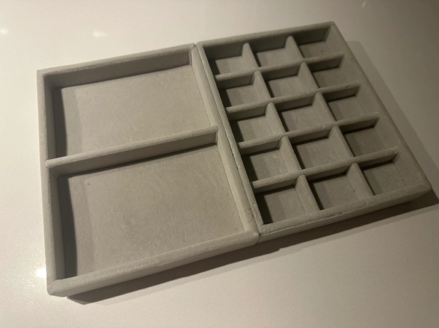 Two-piece organizer. One side features multiple small compartments, the other has two larger sections. Perfect for storing earrings, rings, or other small jewellery.