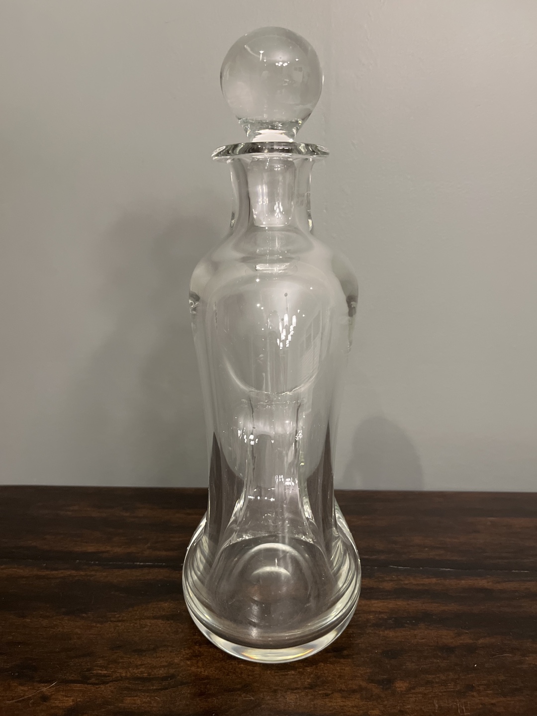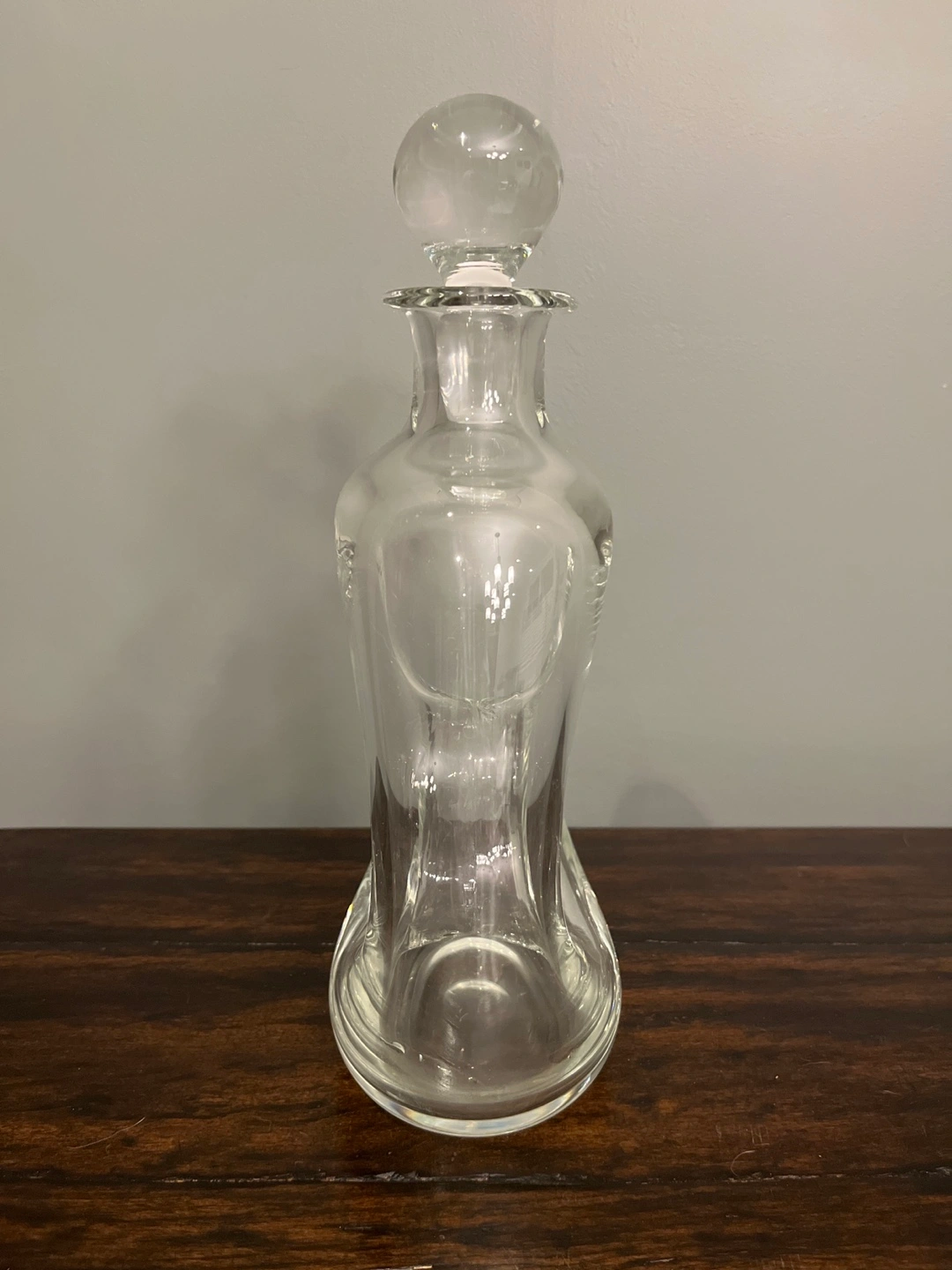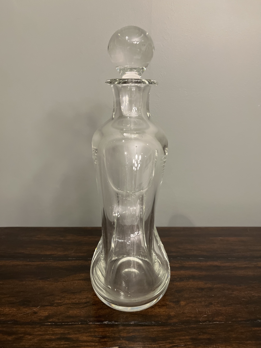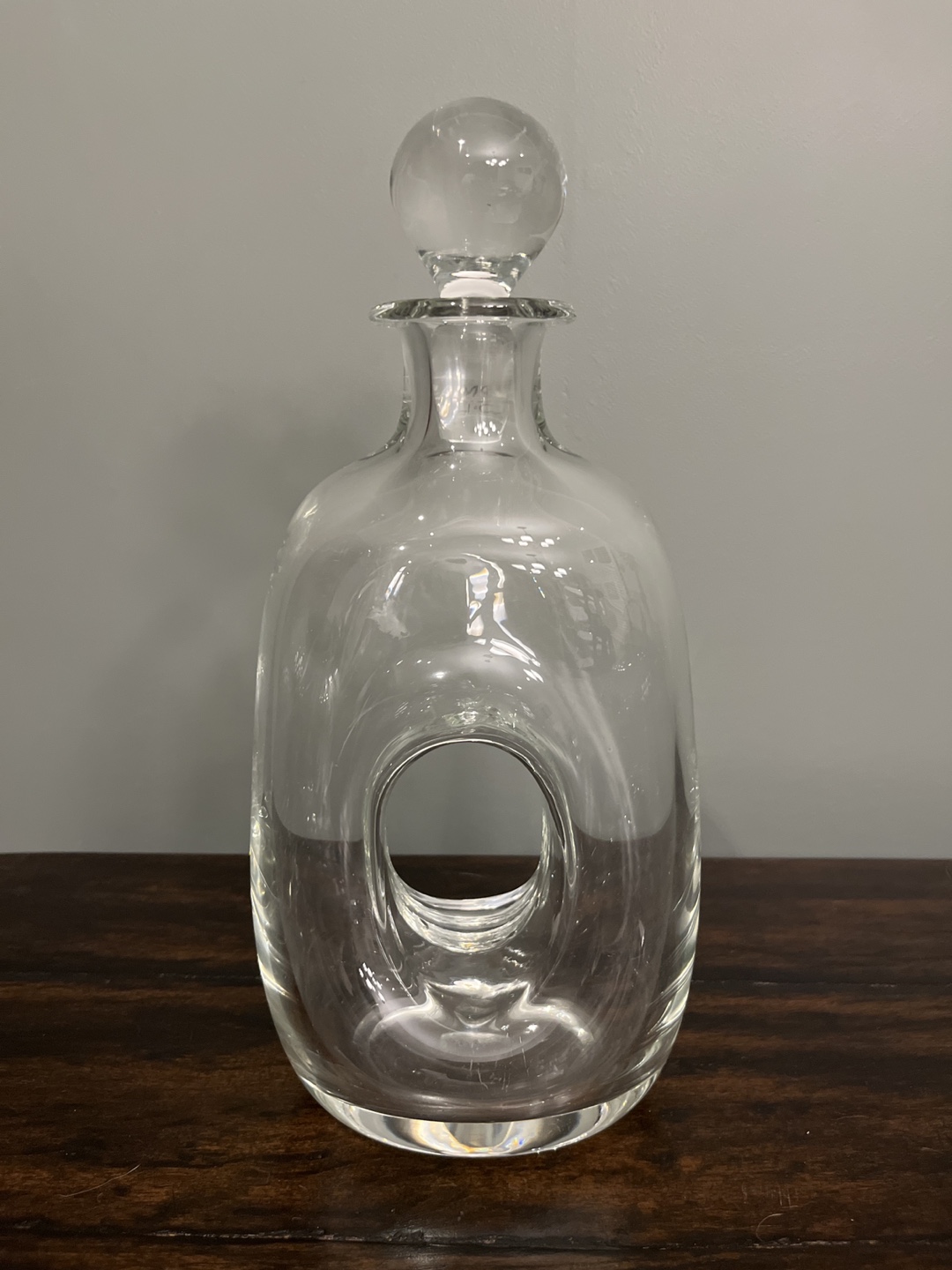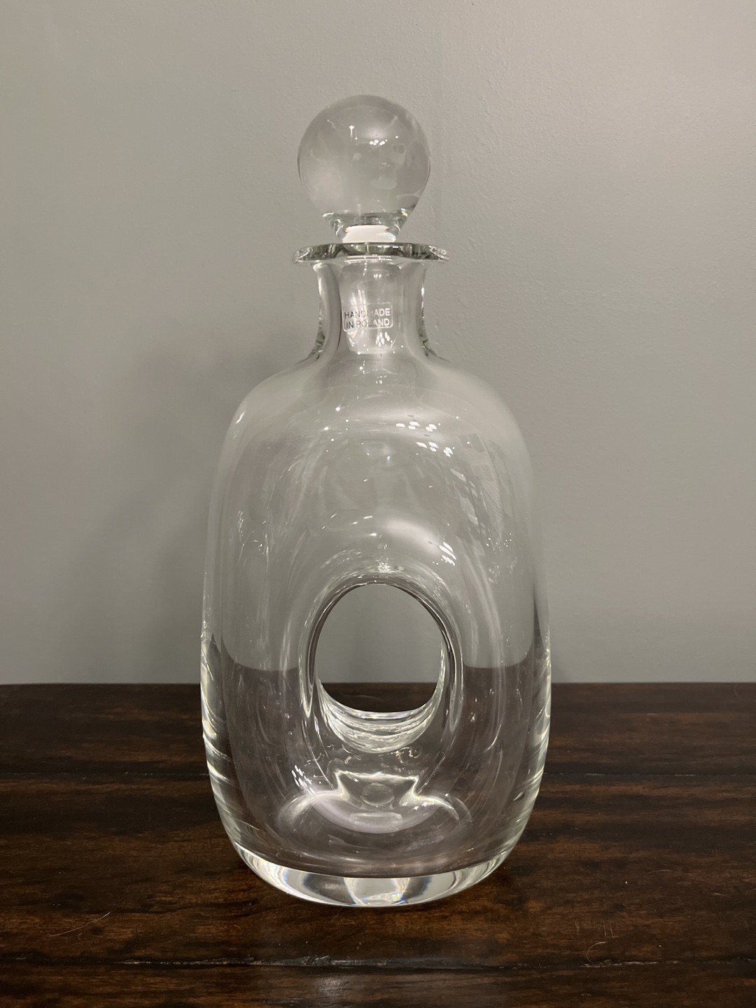 Clear glass decanter, unique design. Features a round stopper. Hand-made in Poland. Great for liquor or decorative use.