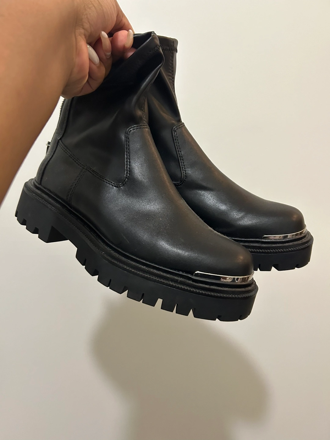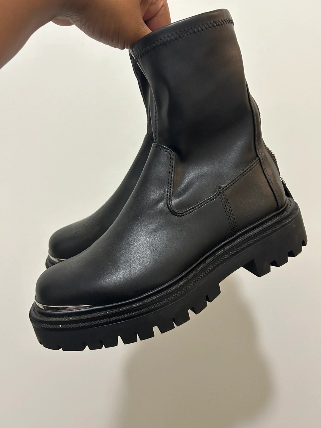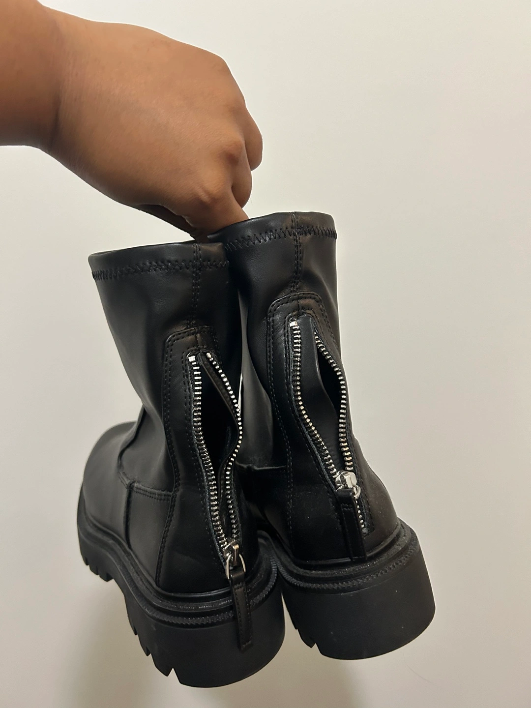 Women's black ankle boots. Features a chunky sole, side zippers, and a sock-like fit. Good for fall and winter.