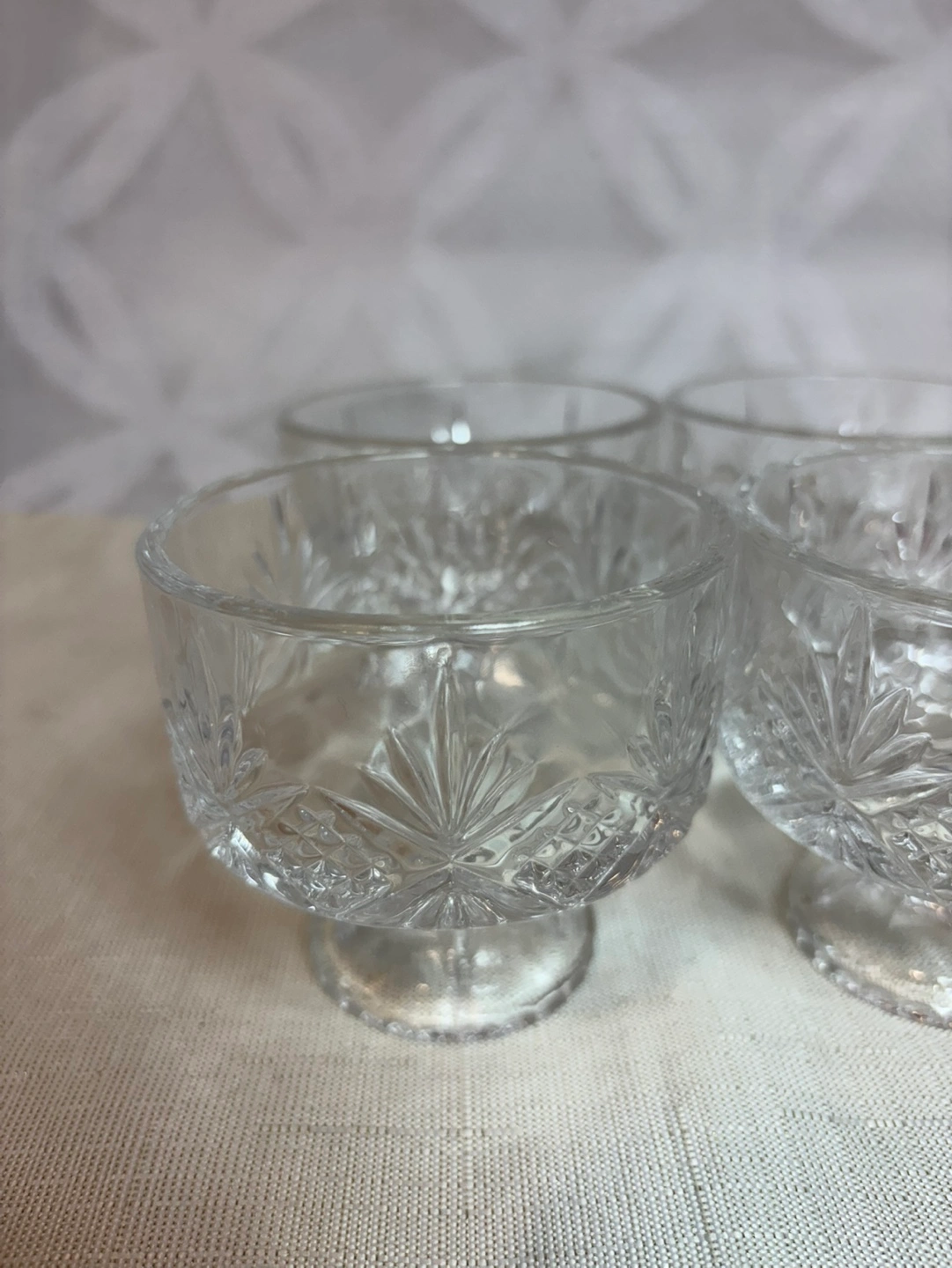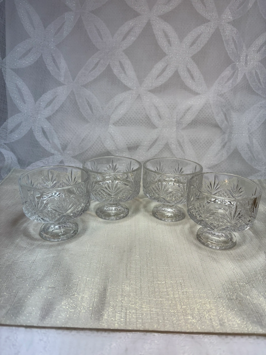 Four lovely vintage crystal dessert cups. Elegant etched design. Perfect for serving desserts or custard or ice cream. Small pedestal and criss cross pattern. It is in very good condition with no chips or cracks. H - 8 cm, D - 8 cm. SMOKE FREE AND PET FREE HOME. CASH only please. Thalnks for looking and HAPPY SHOPPING !