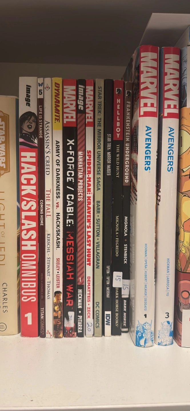 Lot of various graphic novels and comic books. Includes Marvel and other titles. Some titles include Avengers, Hackslash Omnibus, Spider-man, Hellboy, Star Trek. Mostly in good condition. Check images for specific titles.