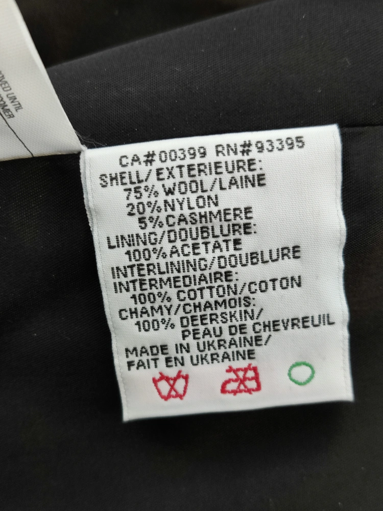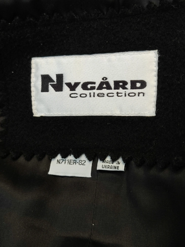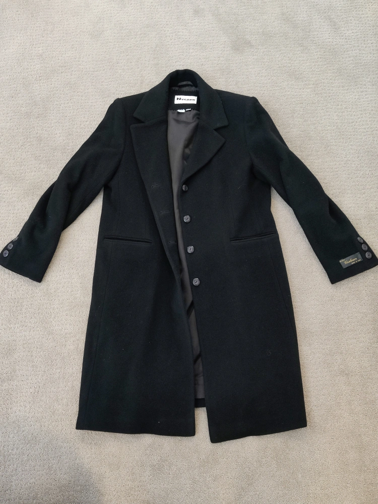 174I am selling a Nygard Collection Wool & Mixed Cashmere Women Ladies Black Dress Button Front Single-Breasted Winter Coat Jacket in used, excellent condition. Shoulder pads on the shoulder of the jacket. Jacket vent/slit on the back of the jacket. No rips or tears. Made in Ukraine. Dimensions (approximate): * Size: 14 * Sleeve (Top of Shoulder to Wrist): 25" * Shoulder to Shoulder: 18" * Total Length (Collar to Bottom Edge): 42" Shell Material: * 75% Wool * 20% Nylon * 5% Cashmere Lining Material: * 100% Acetate Interlining Material: * 100% Cotton Chamy Material: * 100% Deerskin Comes from a pet and smoke-free environment. Pickup in Mount Pleasant (NW Calgary)