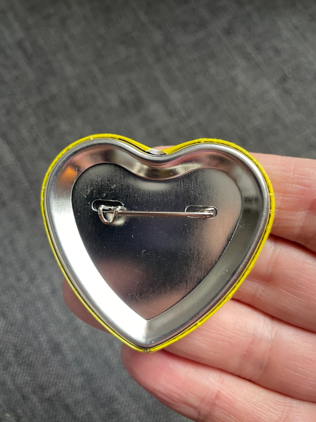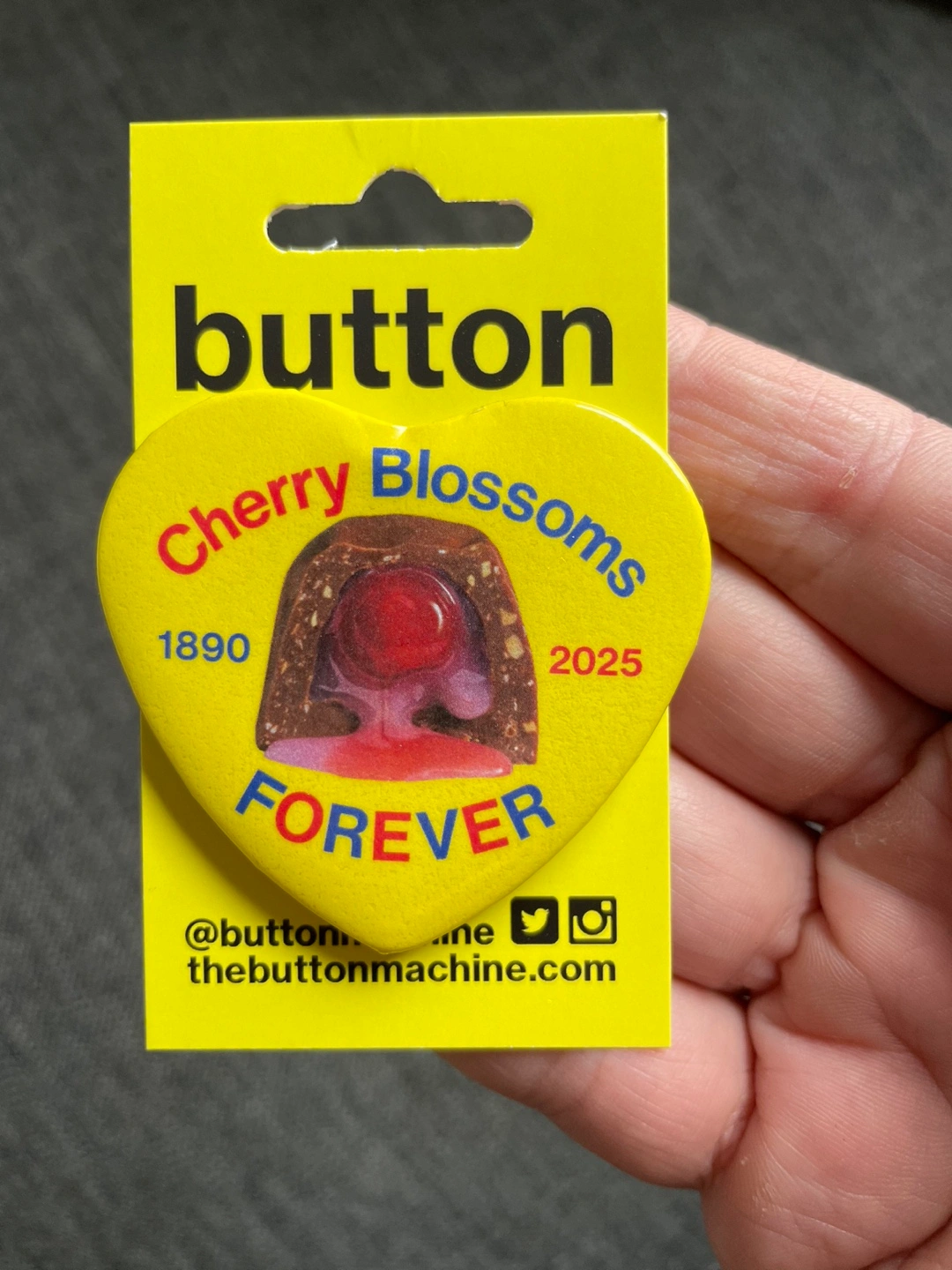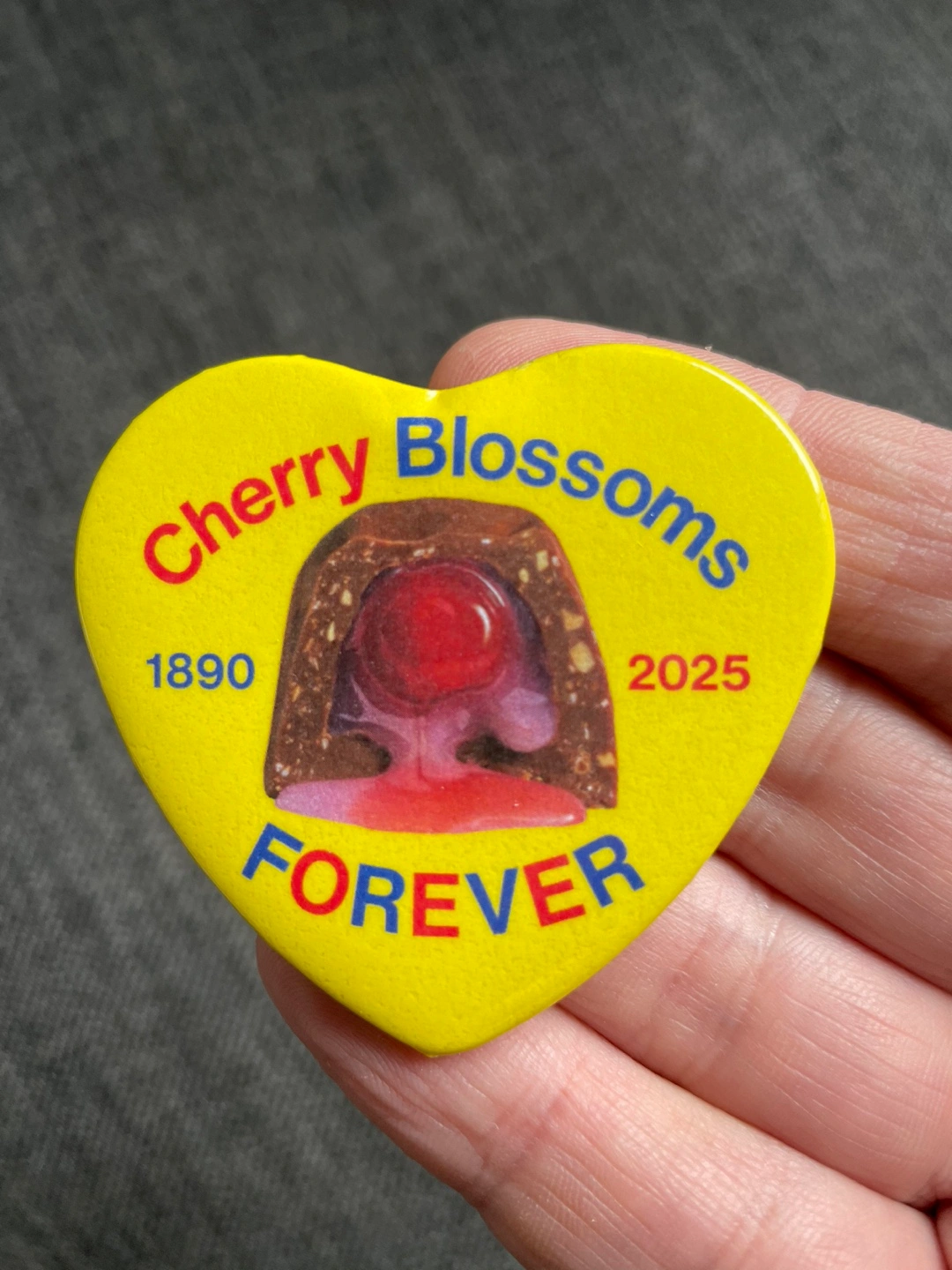 2 x 2.25” heart-shape button commemorating the end of the Cherry Blossom chocolate.