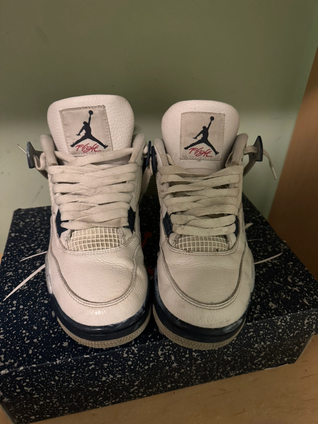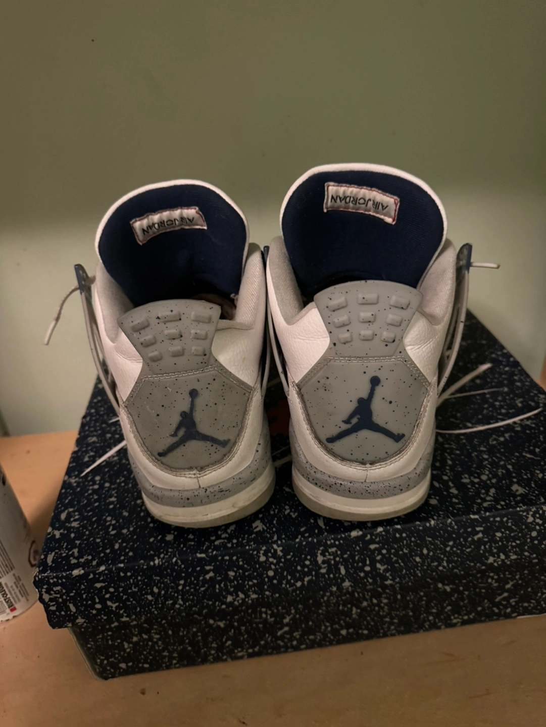 Rare Air Jordan 4 Retro 'Cool Grey' sneakers. Off-white leather upper. Navy blue accents. Grey speckled midsole. Original box included. Pre-owned.