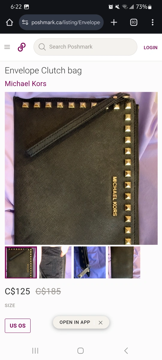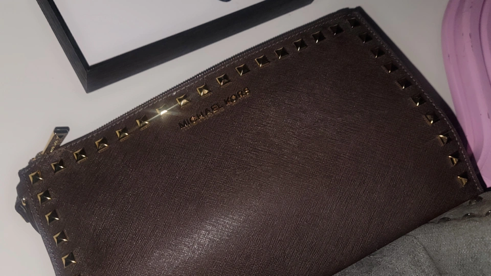 Authentic MK Brown saffiano leather clutch. Features gold studs and zip closure. MK lining interior with multiple slots. Excellent condition. Great size for travel, night out or everyday use!