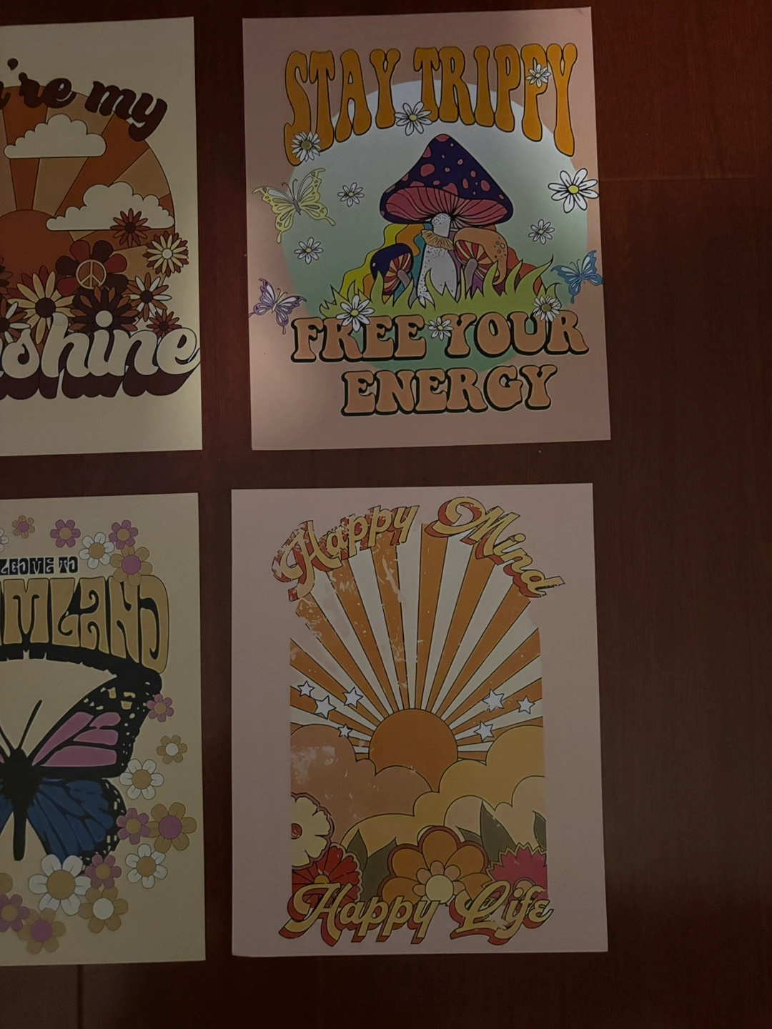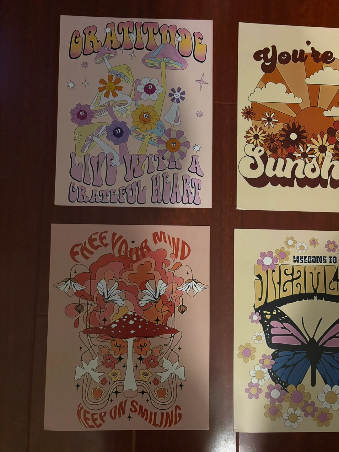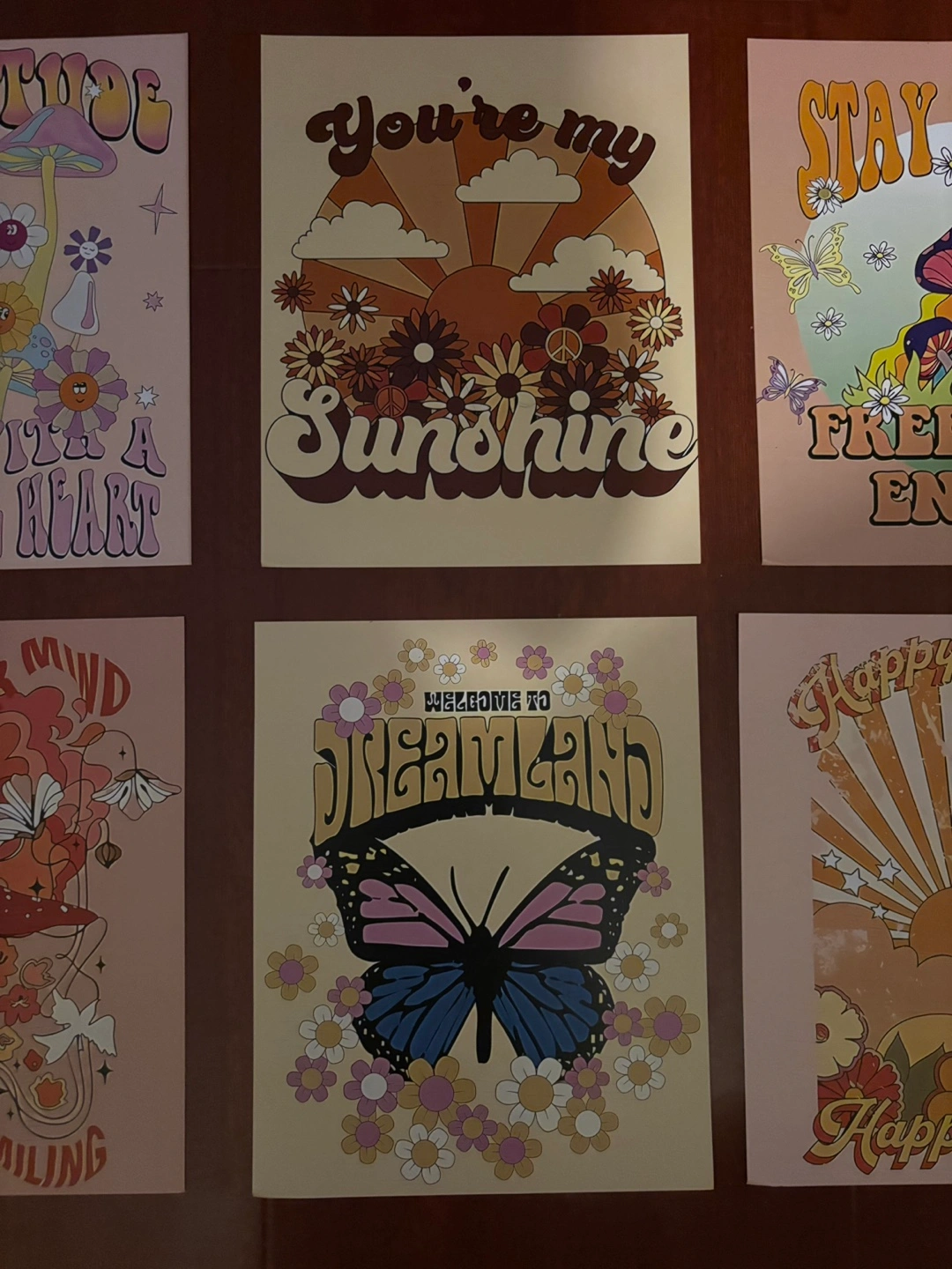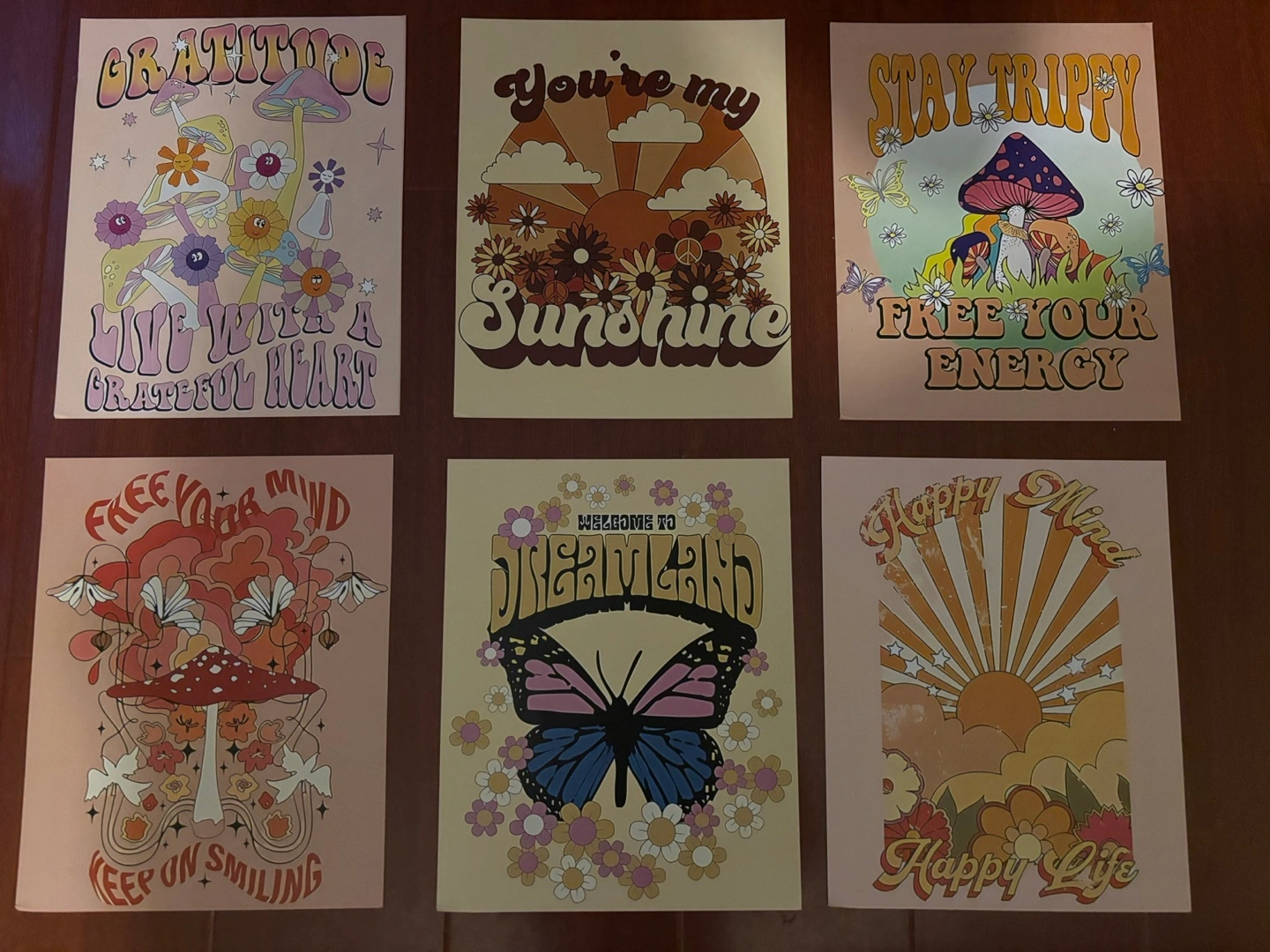 Set of six prints. Features various 70s-inspired designs. Includes mushrooms, flowers, butterflies, and positive messages. Perfect for adding a retro vibe to your space.