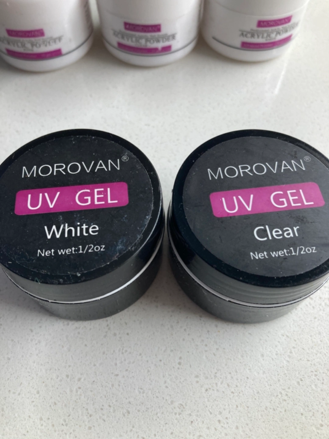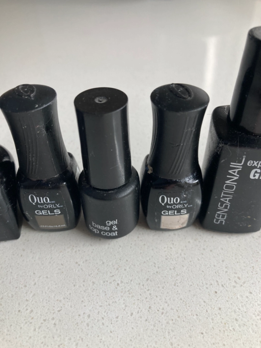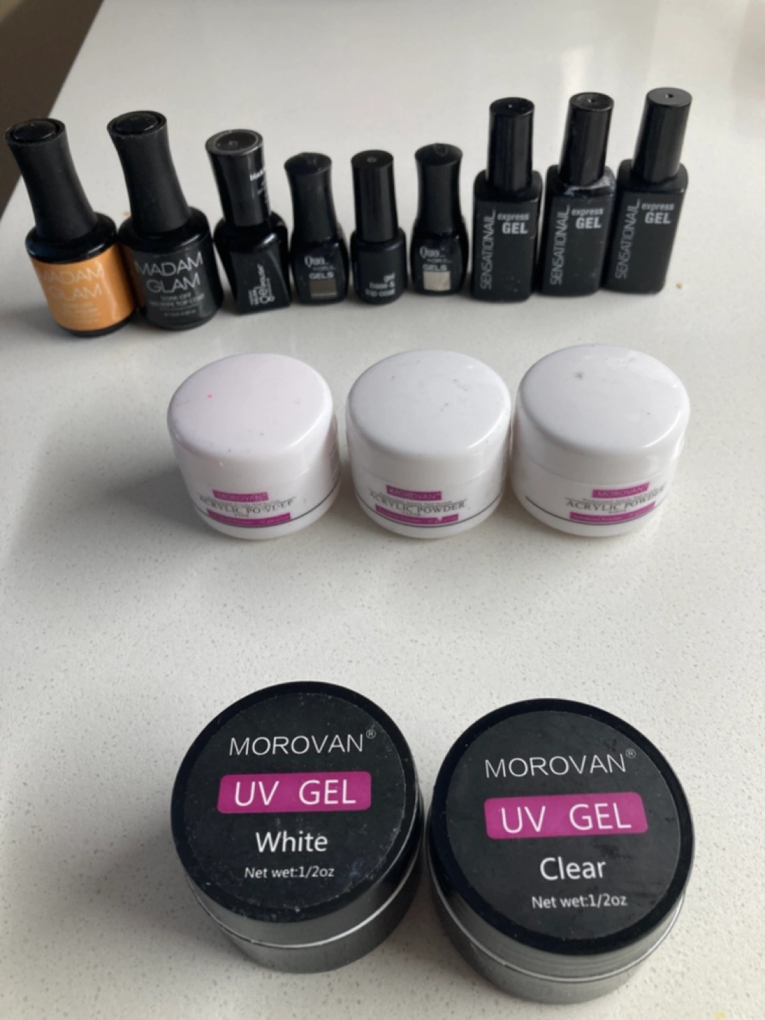 Bulk lot of various nail products. Includes multiple colours of gel polish, base coat, top coat, and pink and white acrylic powder. Morovan and Quo by Orly brands included. Includes UV luggt, but charger is missing. Maybe you have an extra charger?