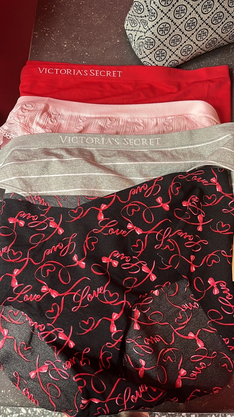 Four pairs of Victoria's Secret underwear. Includes one red, one pink, one grey striped and one black with a pink hearts and bows print.