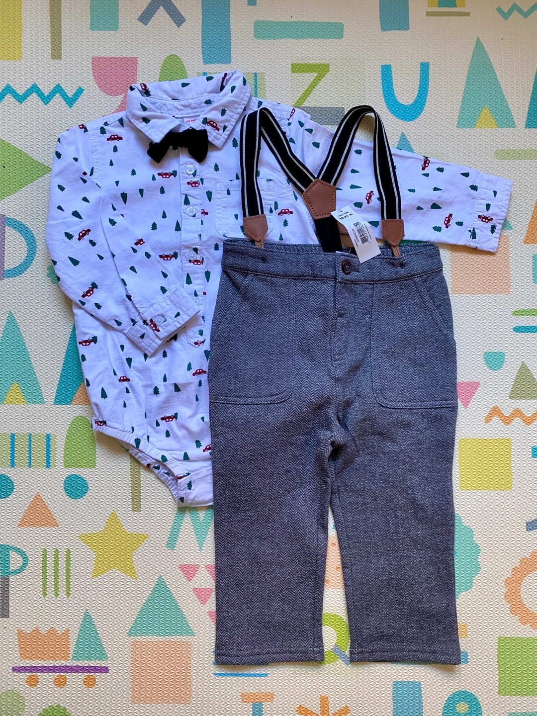Three-piece baby outfit. Long-sleeved button-up shirt with festive Christmas print, pants with suspenders, and a black bow tie. Perfect for holiday photos or special occasions. Pants are brand new, never worn, tags attached. Shirt is worn once.