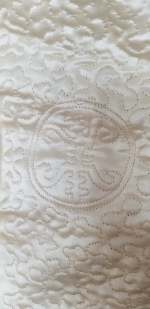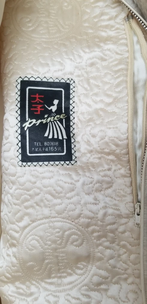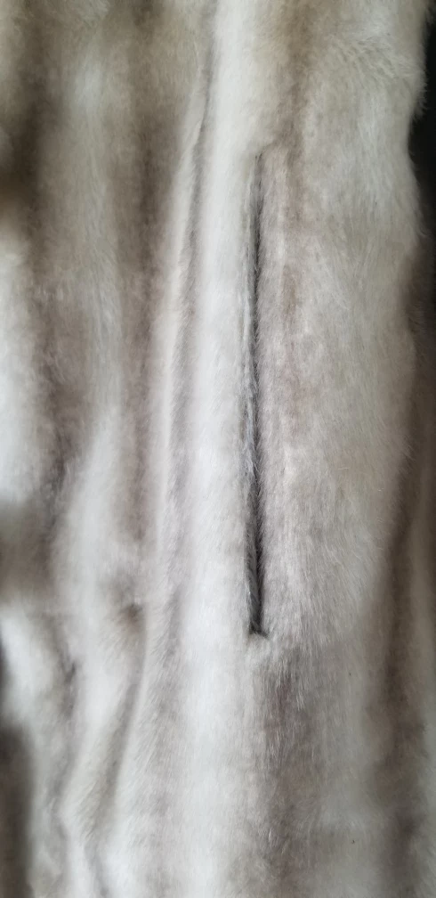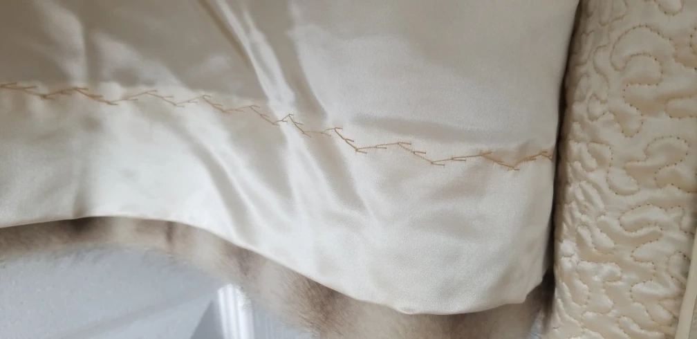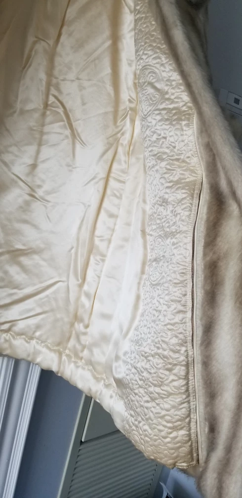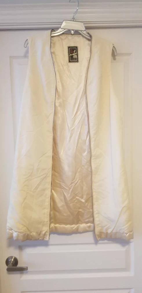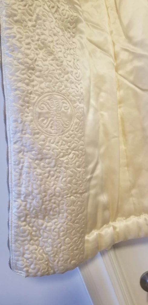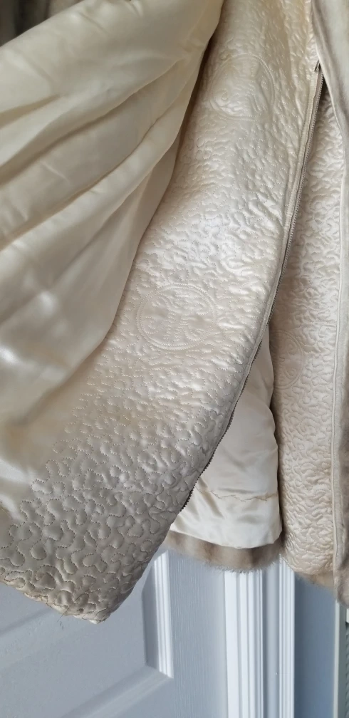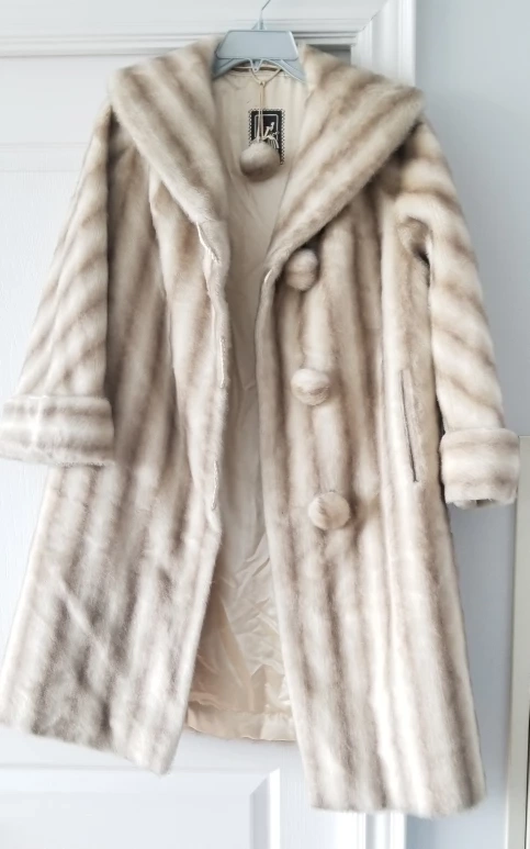 Striped faux fur coat. Features a large collar, long sleeves, and decorative pom-pom closures. Fully lined with quilted satin lining. Inside zipper pocket on one side. Removable insulated lining with beautiful detailed embroidery. Excellent, like-new condition.