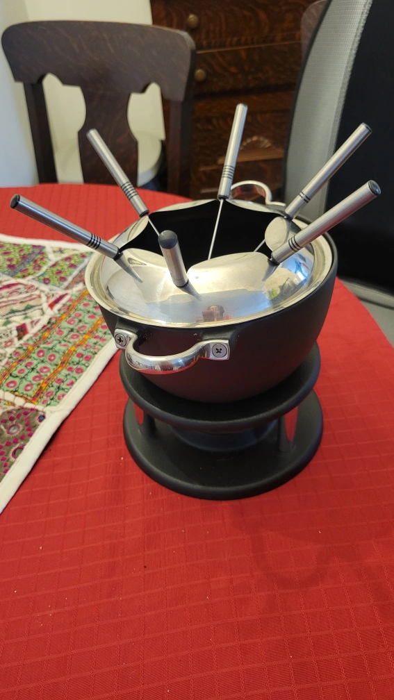 New never used elegant black cast iron fondue pot made by Swissmar includes six fondue forks and a stand. Great for cheese, meat or chocolate fondue let the party begin !