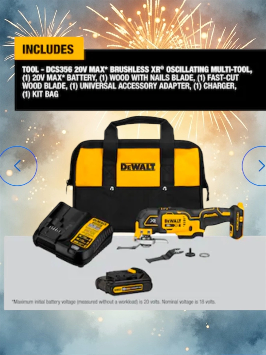 20V MAX* brushless XR oscillating multi-tool. Includes one 20V MAX battery, wood with nails blade, fast-cut wood blade, universal accessory adapter, charger, and kit bag. Great for various projects.