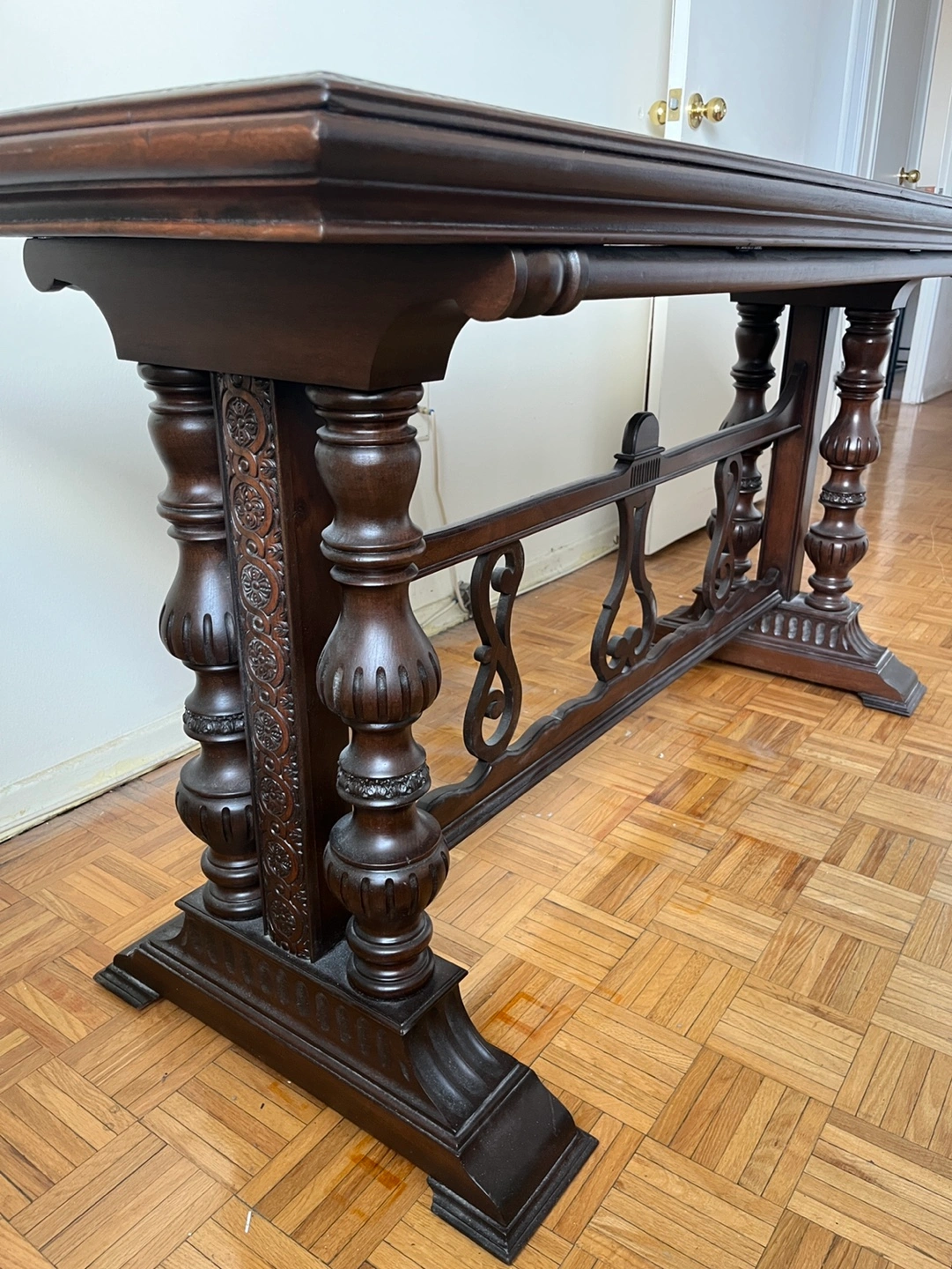 Antique Tudor or Elizabethan-Style wooden Foyer Table with carved detail, solid wood table with bulbous legs and low stretcher, uses traditional woodworking joinery techniques.