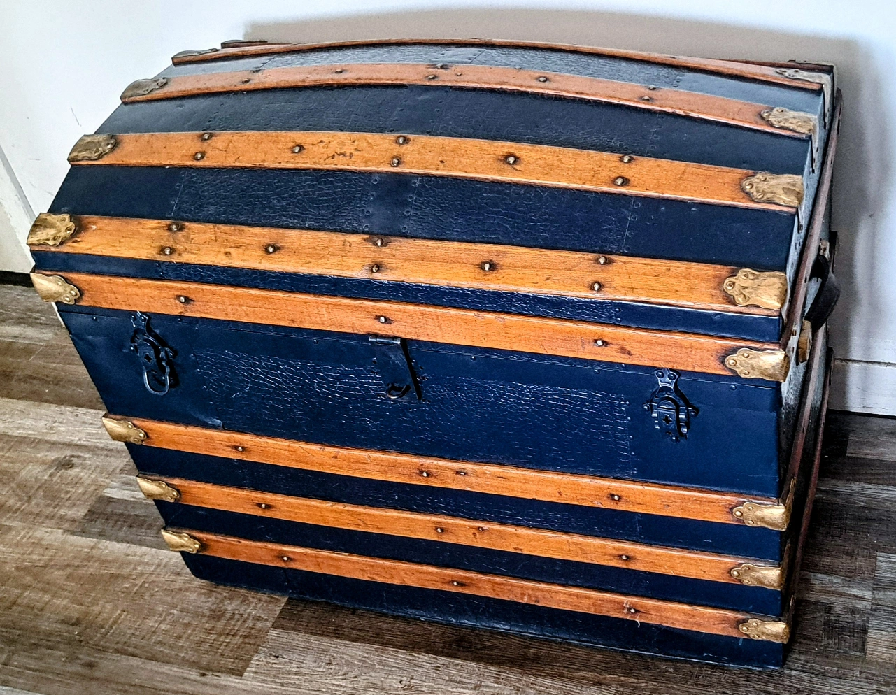 Unique antique dome top trunk. Dark blue exterior with wood trim. Interior features wood and a vintage label. Metal hardware. Great storage or decorative piece.
