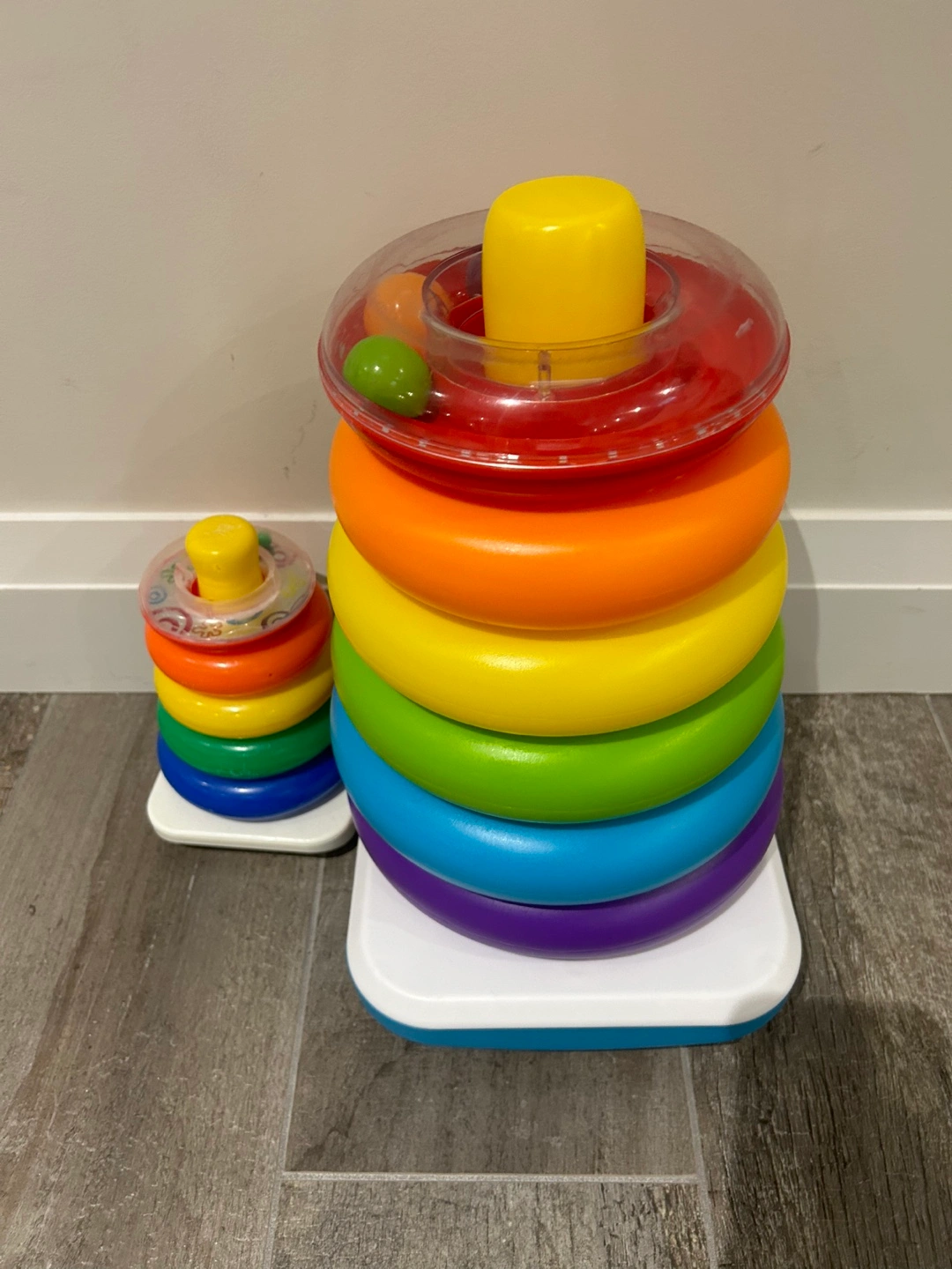 Colourful stacking ring toys. The large one is in great condition and great for toddlers. Includes multiple rings and a base. Bright colours and fun design. Small one is a freebie if wanted.