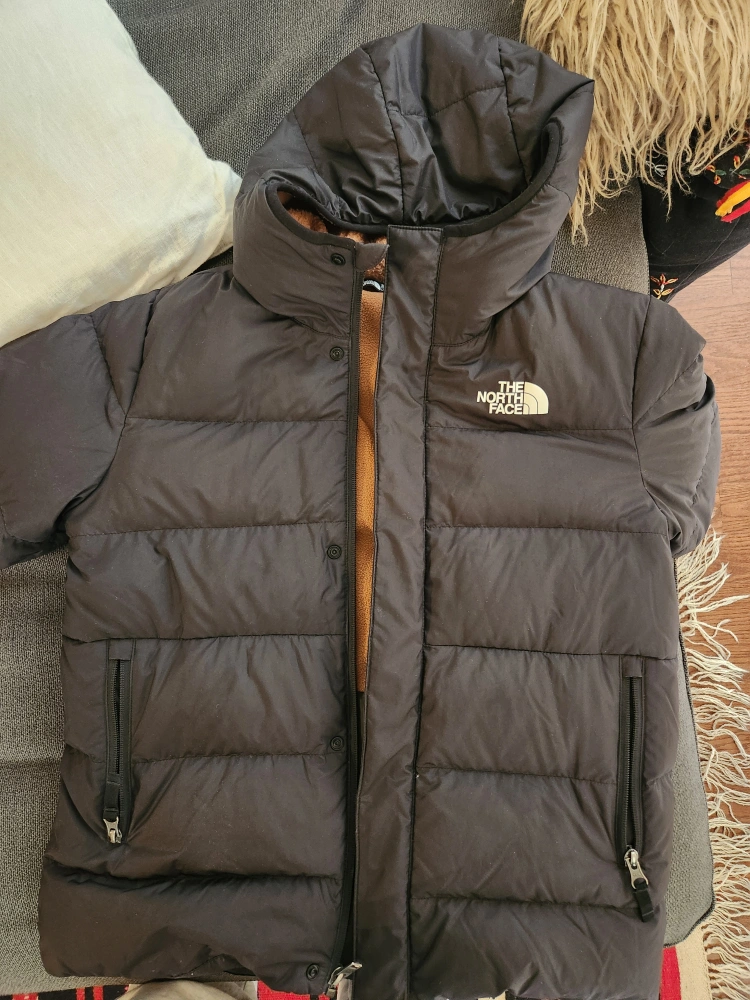 Black puffer jacket. Features a brown sherpa fleece lining. Hooded. Barely worn, child outgrew it fast. 600 fill recycled down, hood lined with cozy high pile fleece. Super warm and light.