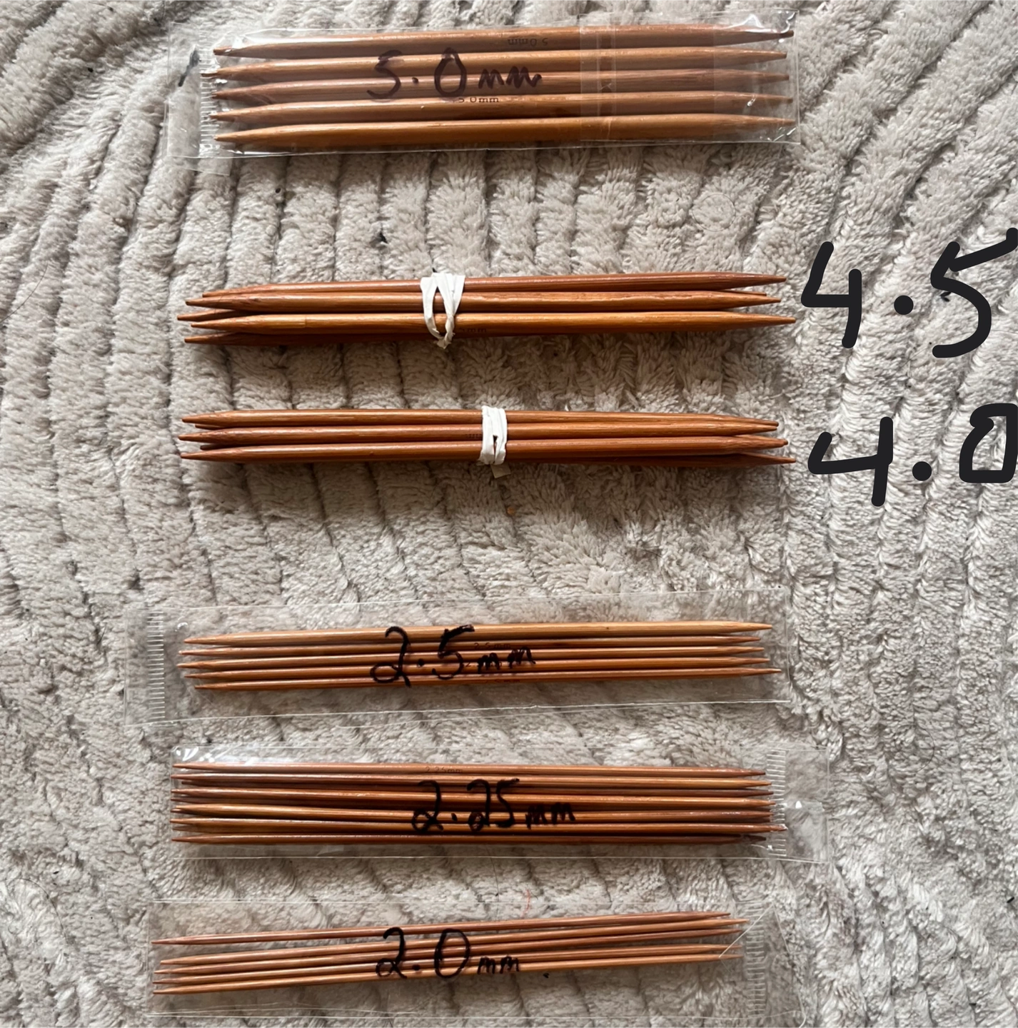 Set of wooden double pointed knitting needles I got as part of a crafting bundle. Very fine, best for delicate projects like lace. Widths/ gauges included: there's 2.0mm, 2.25mm, 2.5mm, 4.0mm, 4.5mm and 5.0mm (see last slide). Willing to give these free if you buy another item. Also willing to trade for sewing or organization items. Pickup only