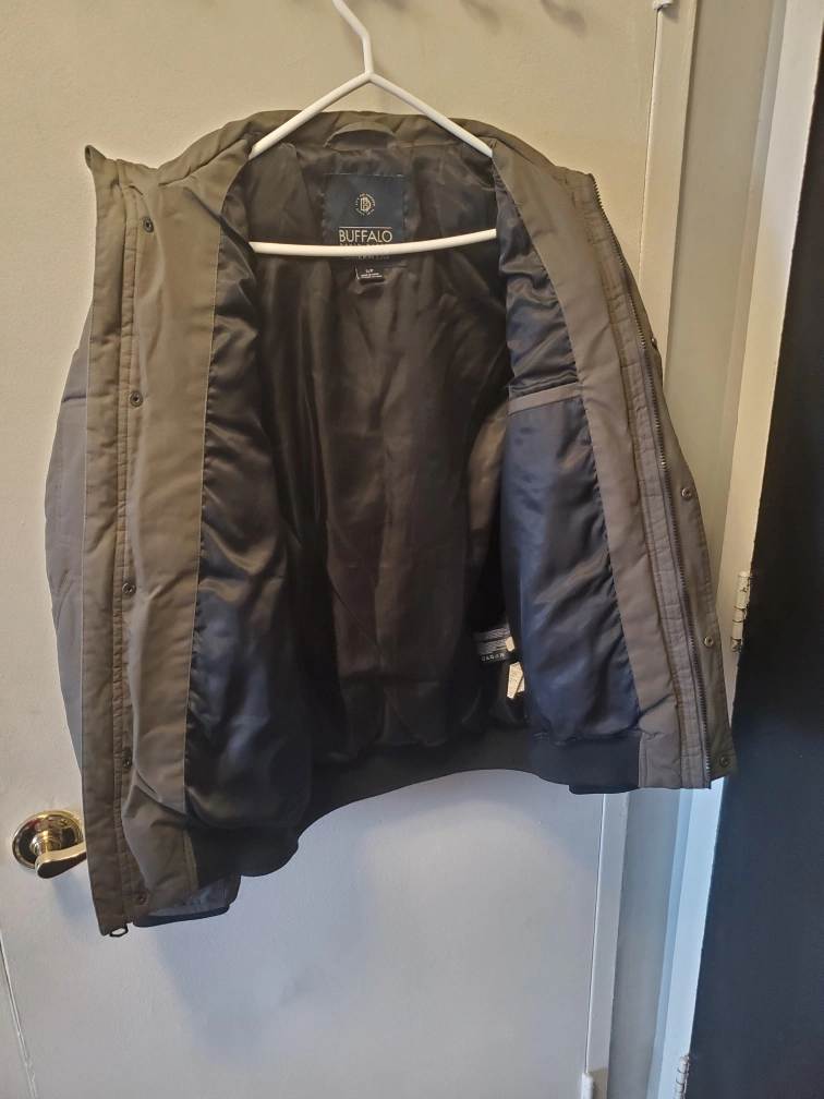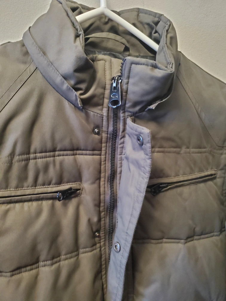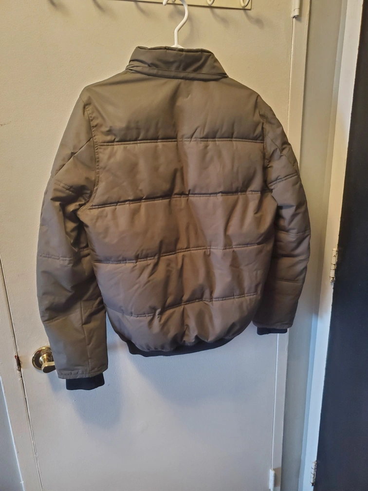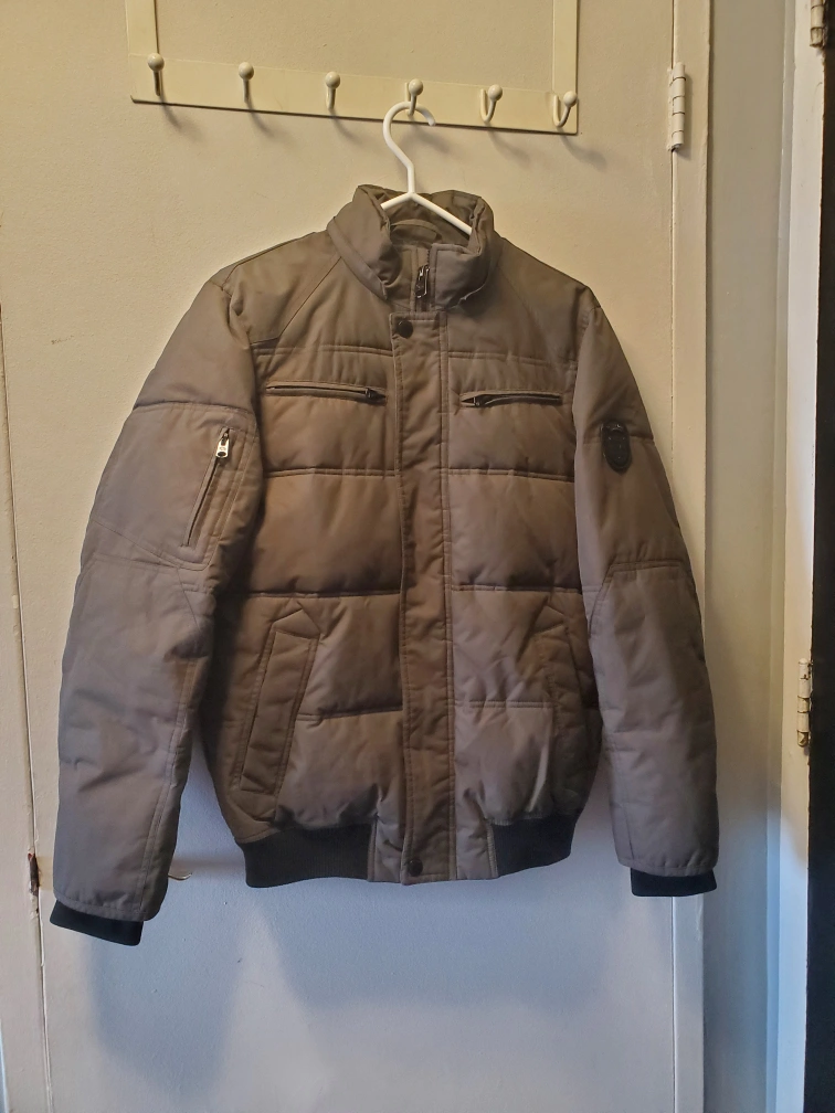 52Men's puffer jacket. Olive green colour. Size small. Features a zipper and snap closure, pockets, and a hood. very good condition only cash price firm no delivery. I have more Winter Jackets Autumn Jackets and Rain jackets for Men's and Boys for sale all size. I have and app Kijjijji and app Karrot. Location Cawthra and Lakeshore Mississauga