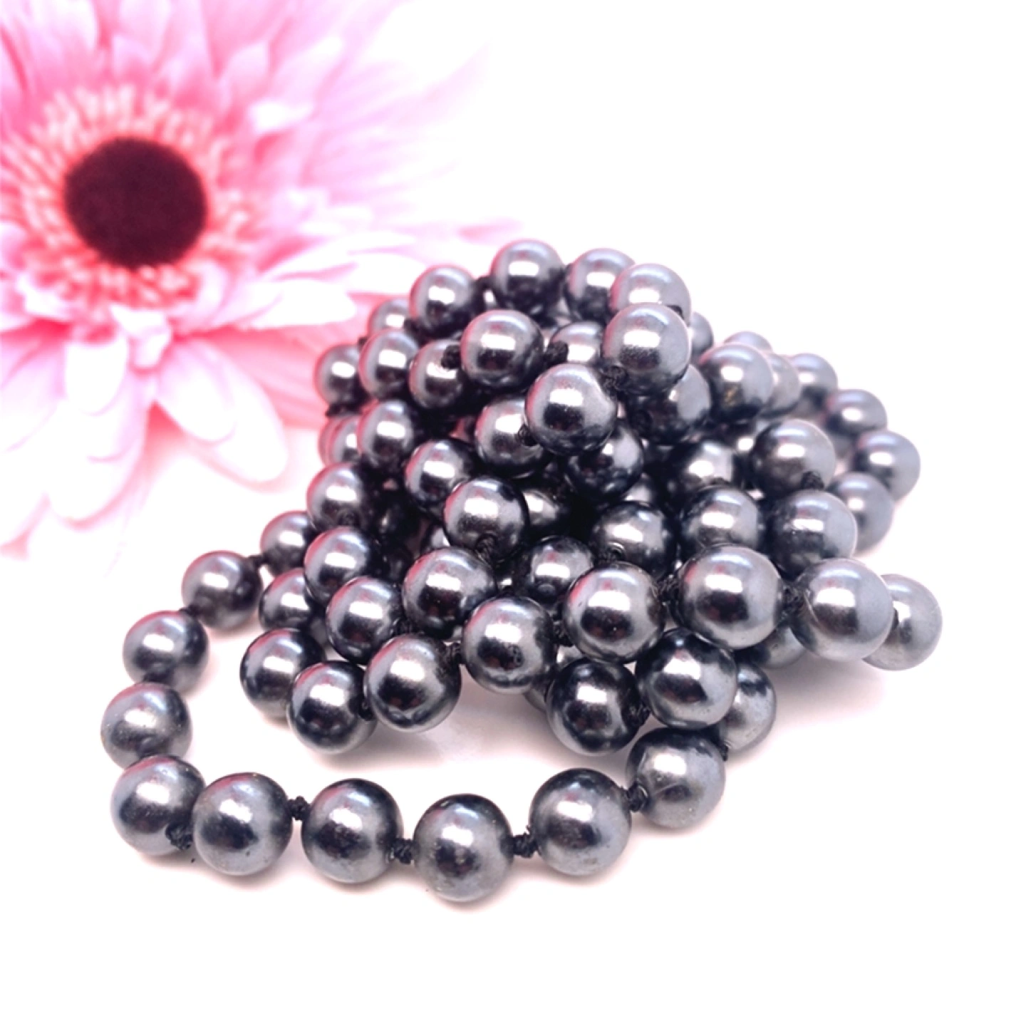 The longest necklace is 35 inches without metal Necklace with broken Clasp is 22 inches Perfect necklace is 18 inches Bracelet is 7 inches. All faux pearls All 8MM in size