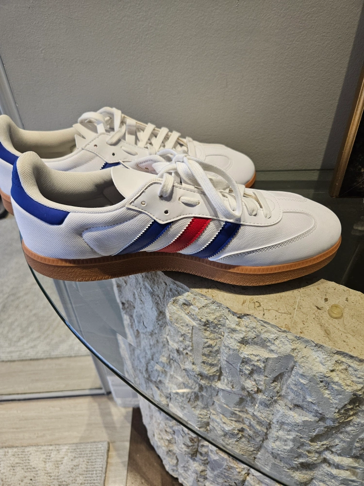 Adidas Samba sneakers. White leather upper, gum sole, blue and red stripes. Vegan-friendly. Size not specified, please check the photos.