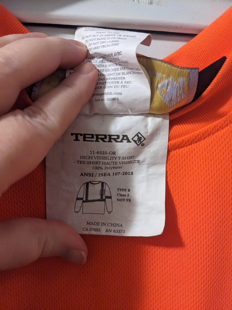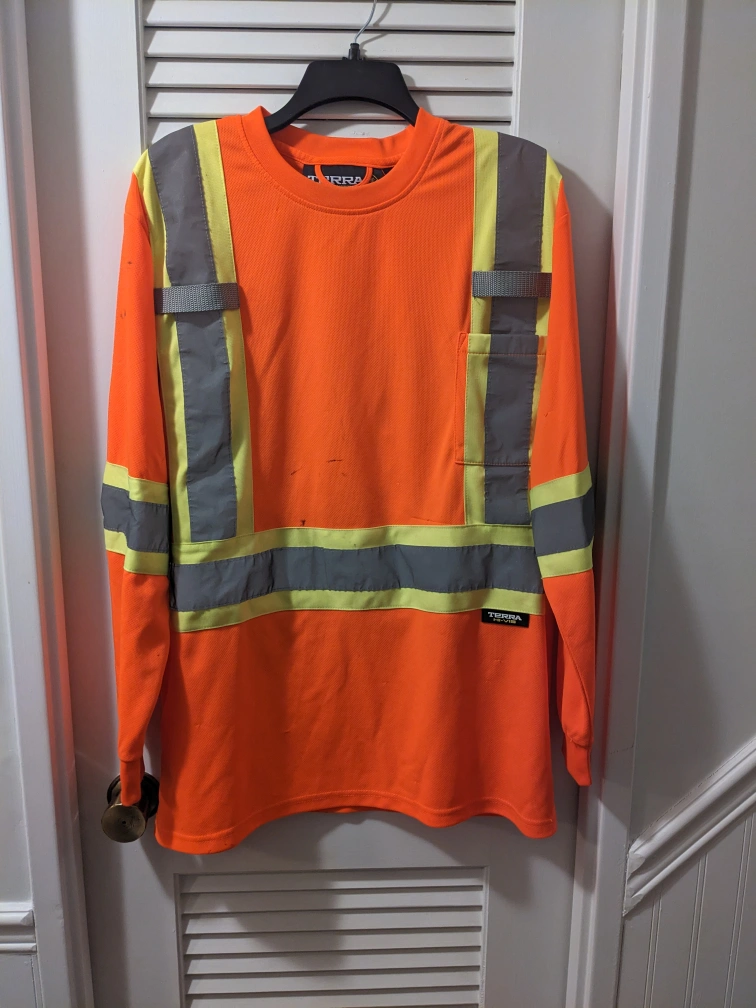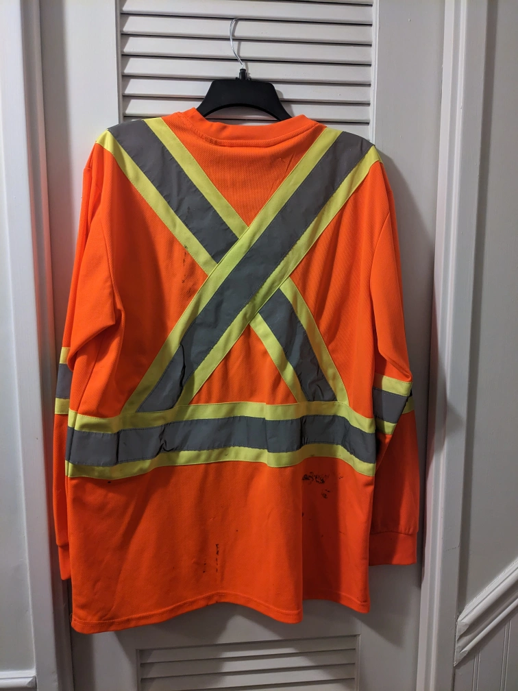 Orange high-visibility long-sleeve work shirt. Features reflective tape. Some minor oil stains. Made in China.