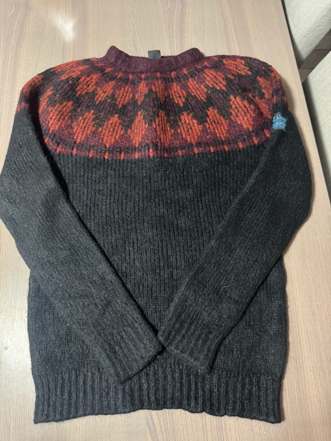 Size small, black and rust coloured knit. Fair isle pattern. Long sleeves, crew neck. Made in Italy.