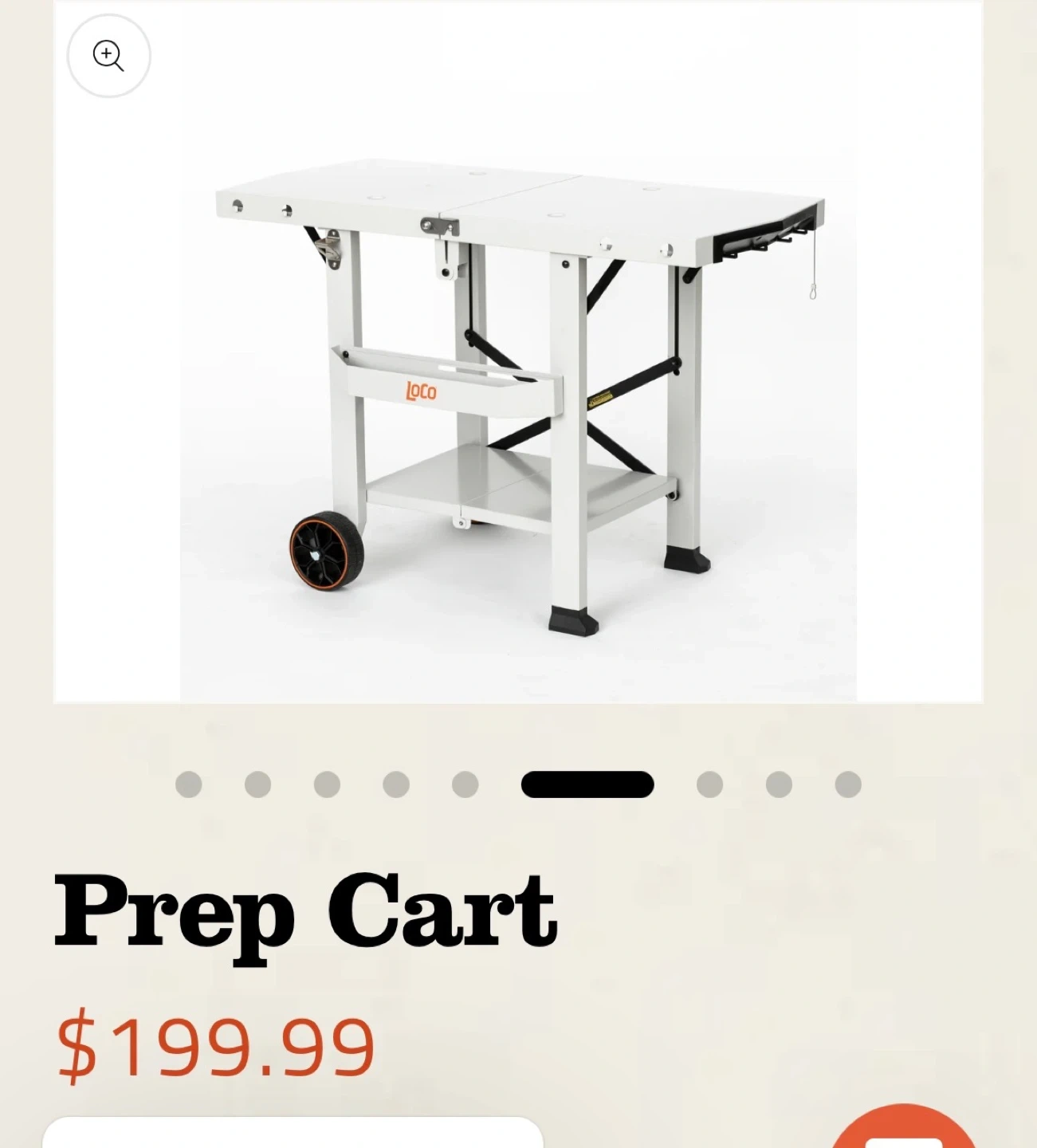 Portable prep cart, folds for easy storage. Features built-in bottle opener, tool hooks, paper towel rack, and condiment rack. Two oversized wheels for easy mobility. Holds up to 150 lbs. Great for outdoor cooking or entertaining.