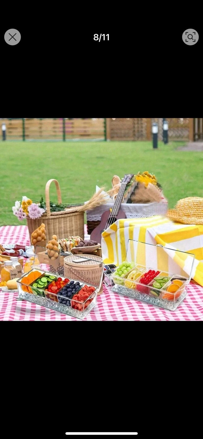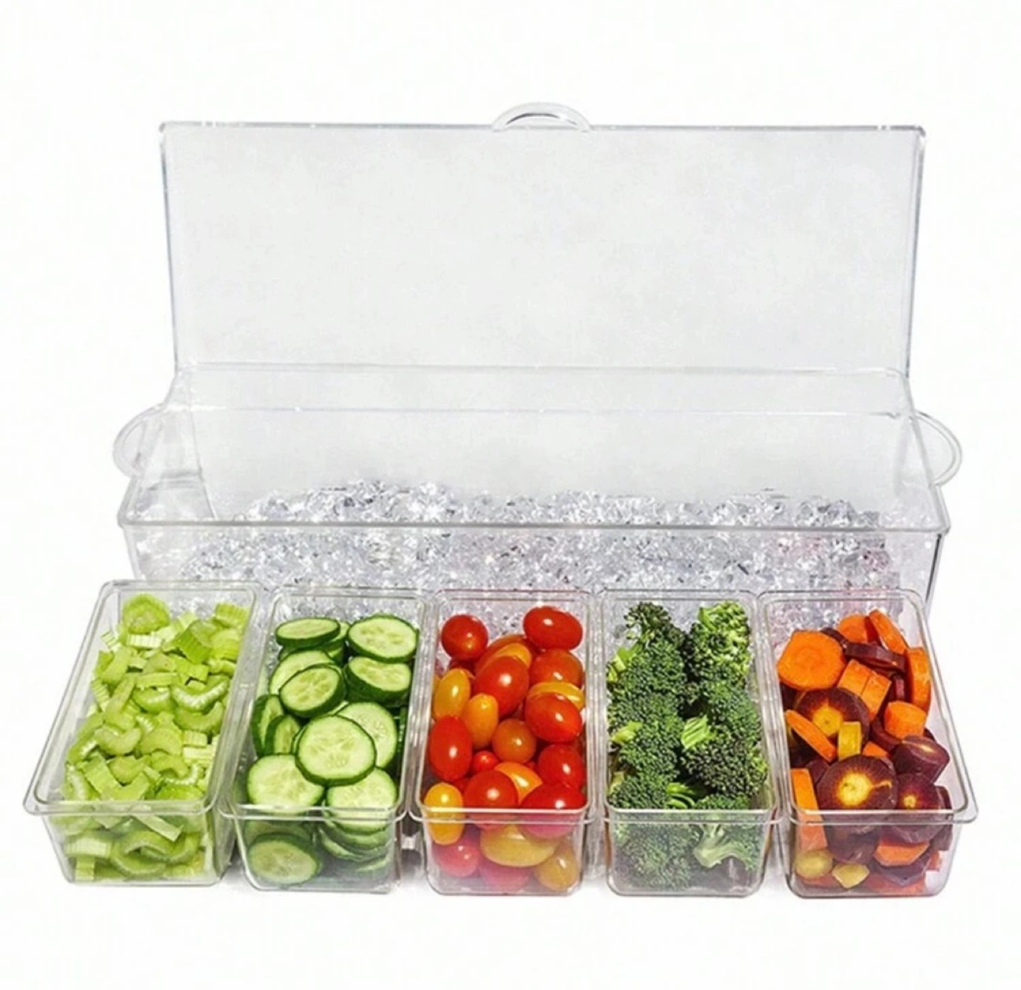 Hinged lid, convenient handle. Five removable compartments. Great for parties, picnics, or everyday use. Holds ice. Food-grade plastic.