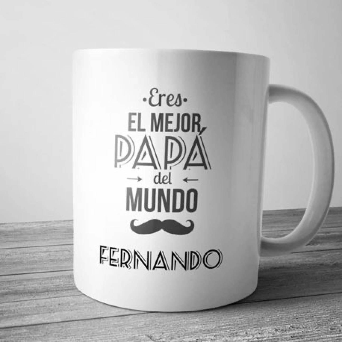 Four unique mugs. Three 11oz mugs with custom designs. One mug features a rooster with chicks, another says "Eres el mejor papa del mundo," and a third says "I'm a mechanic". A set of two engraved wine glasses. Perfect gifts.