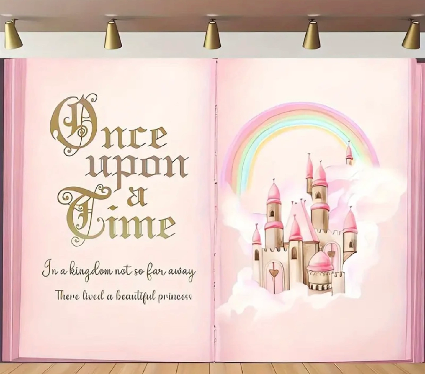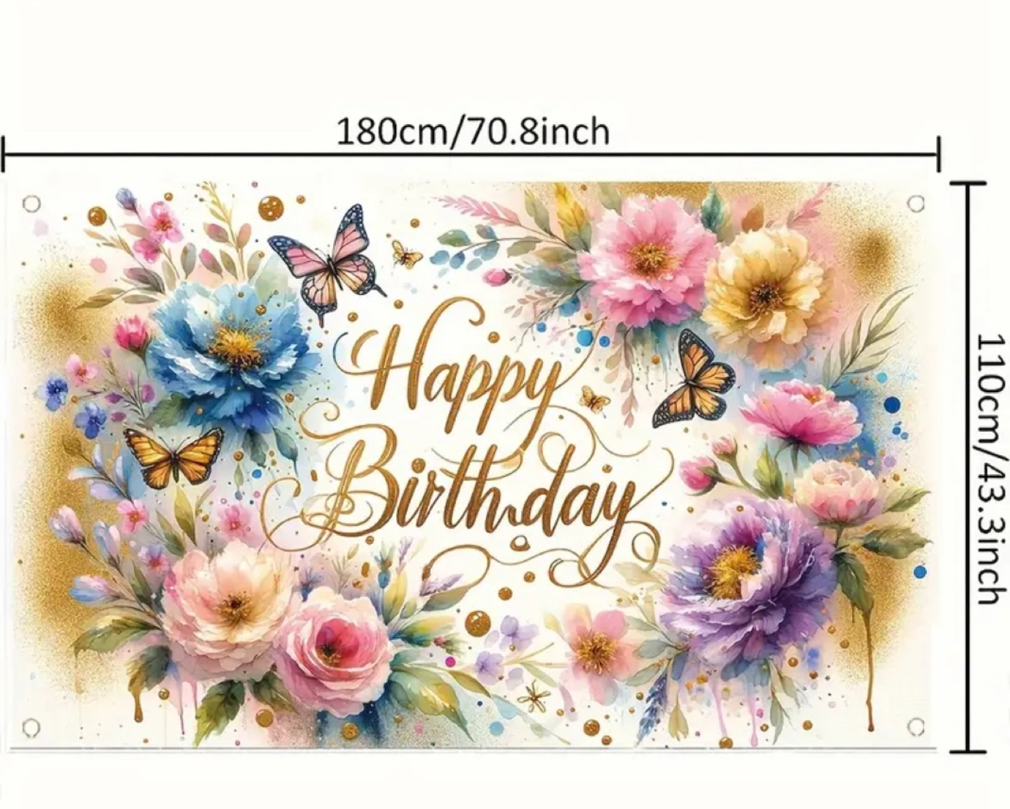 Two large backdrops. One features a fairytale princess castle and rainbow. The other shows a floral arrangement with butterflies and a Happy Birthday message. Perfect for parties or photoshoots. Measures 180cm x 110cm.