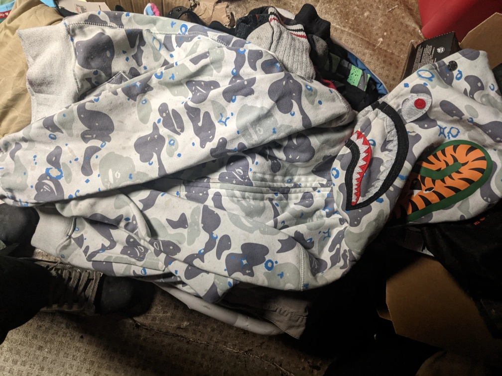Men's zip-up hoodie. Grey and blue camouflage pattern. Features a large shark head design on the hood. Good condition.