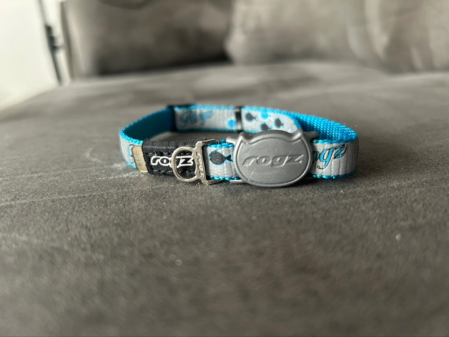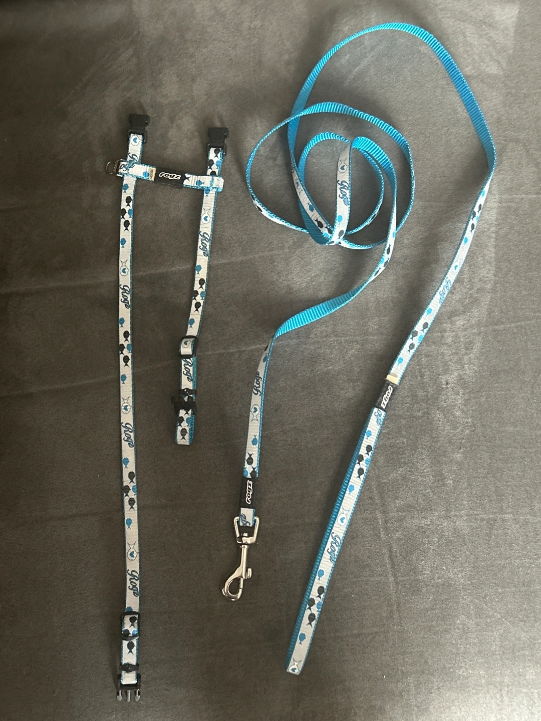 Cute pet (cat or smaller dog) collar, leash & harness bundle. Features a blue and black reflective fish pattern & breakaway safety closure.