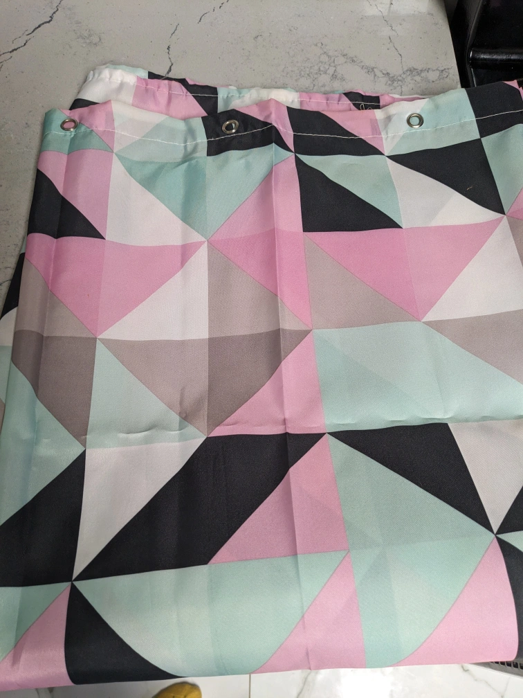 Pink, mint green, grey, and black geometric pattern. Fabric shower curtain with grommets.