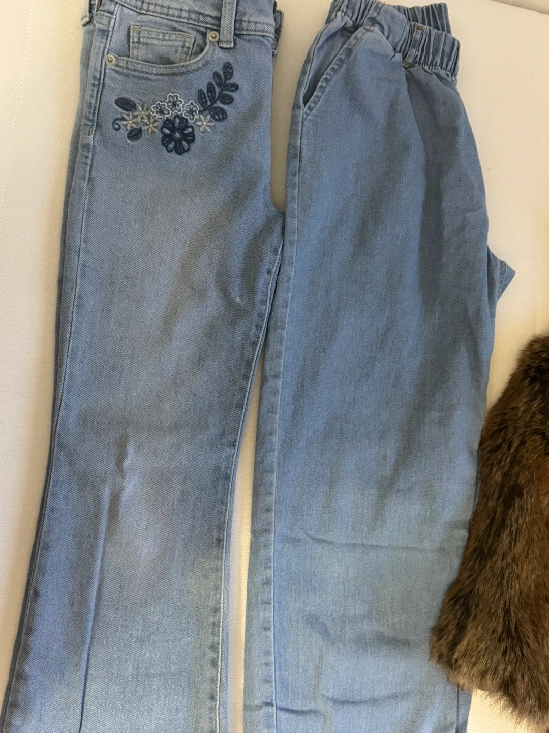 Bundle includes two pairs of girls' jeans, sizes 10 and 14. Also included: brown faux fur vest. It isn’t part of the charge, it’s free.