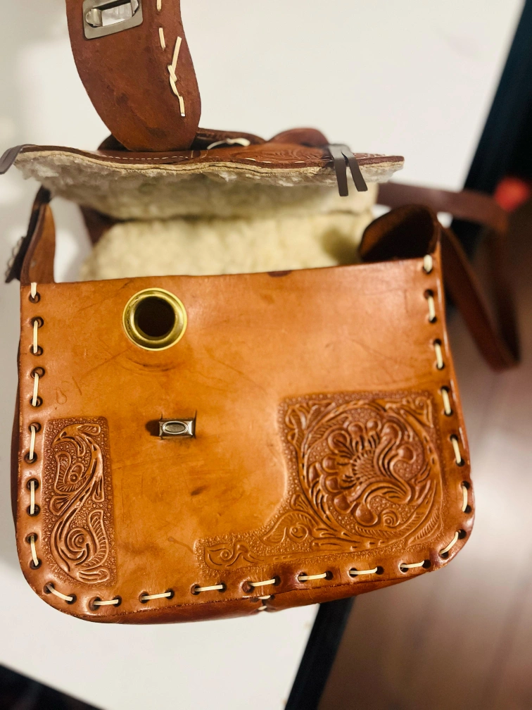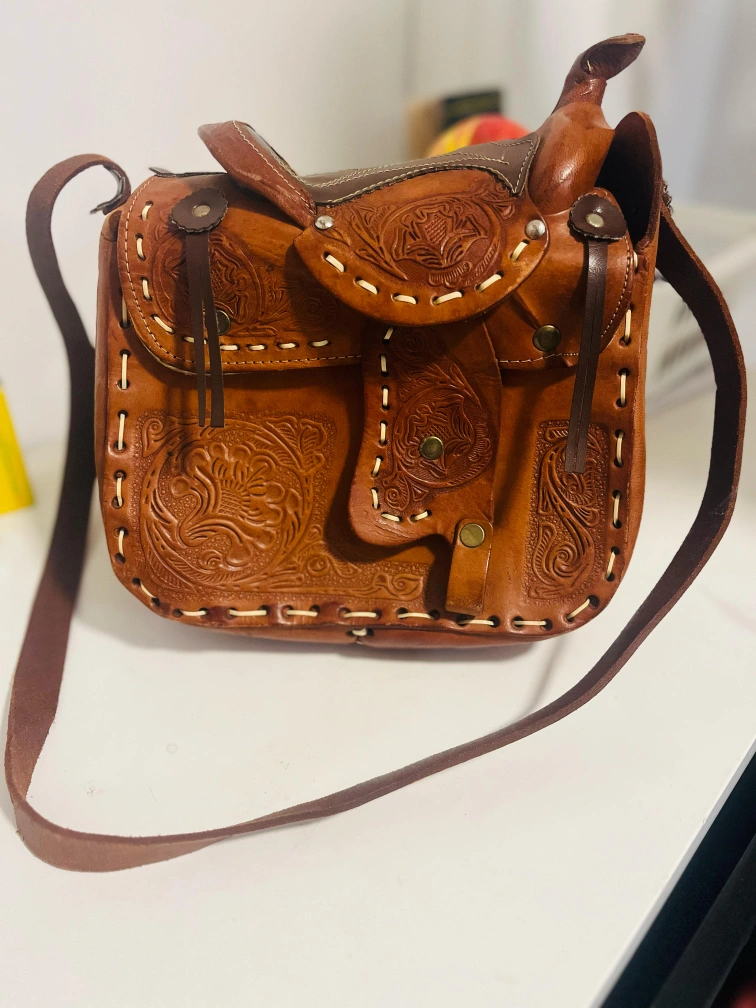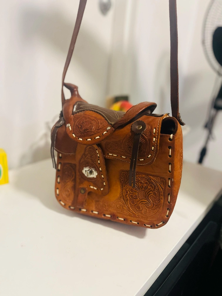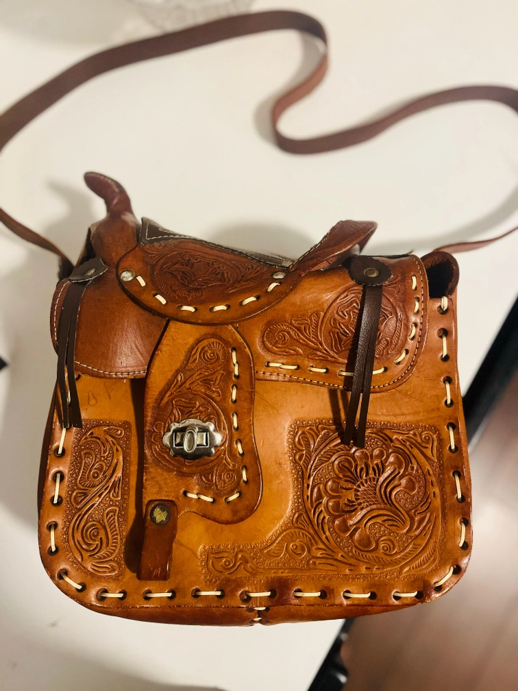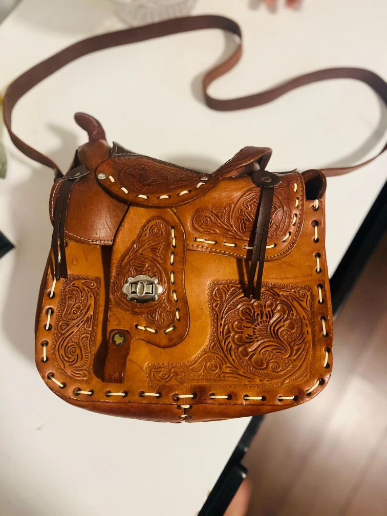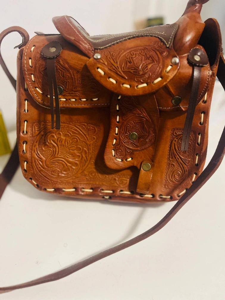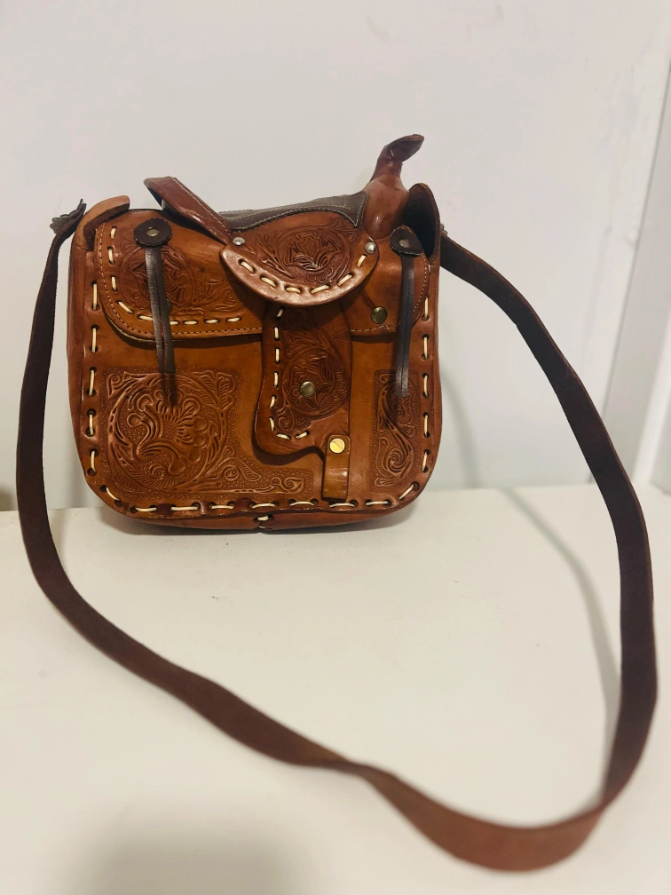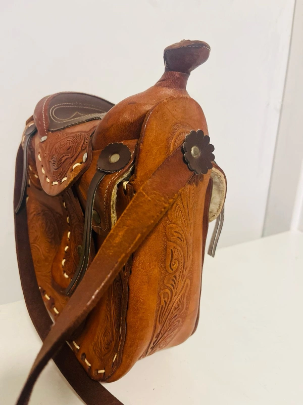 Original pure leather made Japans Unique vintage crossbody bag. Features a saddle design, intricate leather tooling, and an adjustable shoulder strap. Brown leather. Small interior pocket.