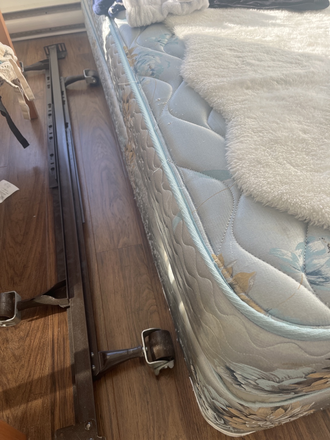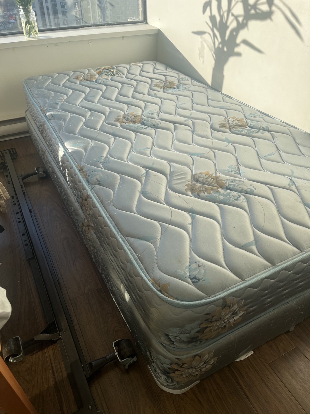 Used twin mattress and box spring set. Light blue floral pattern. Some wear and tear visible. Includes metal frame.