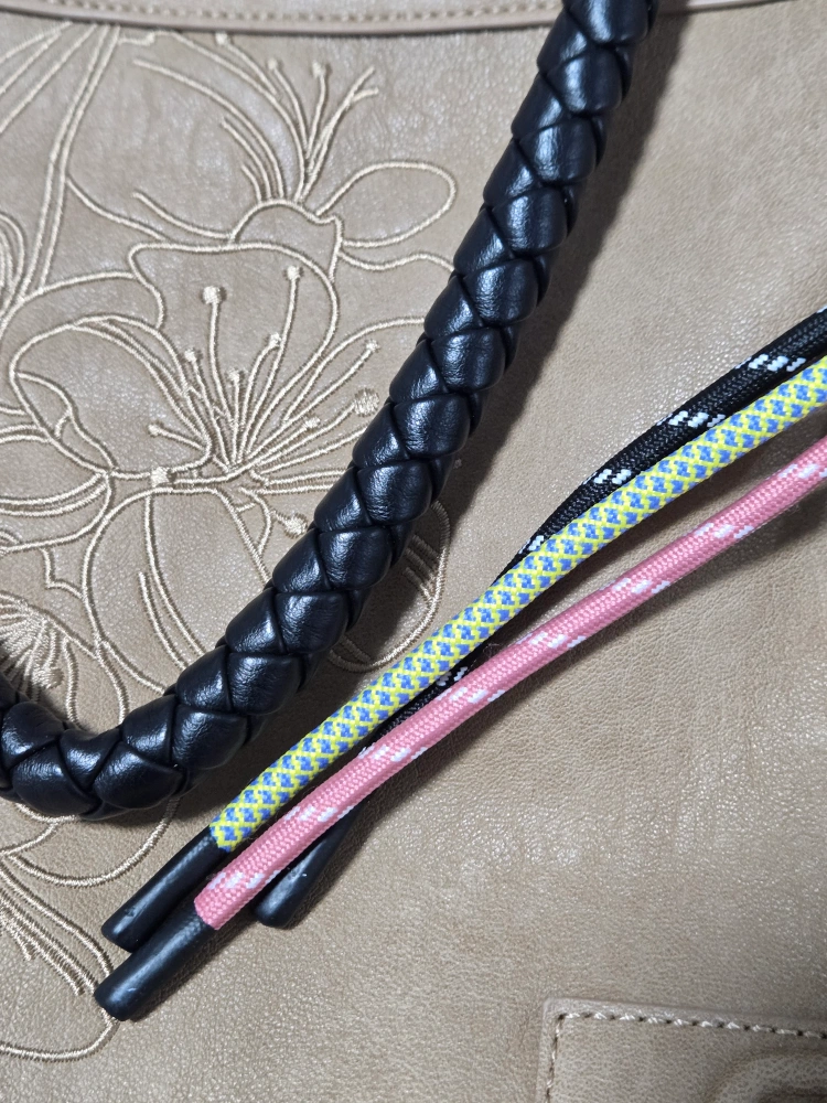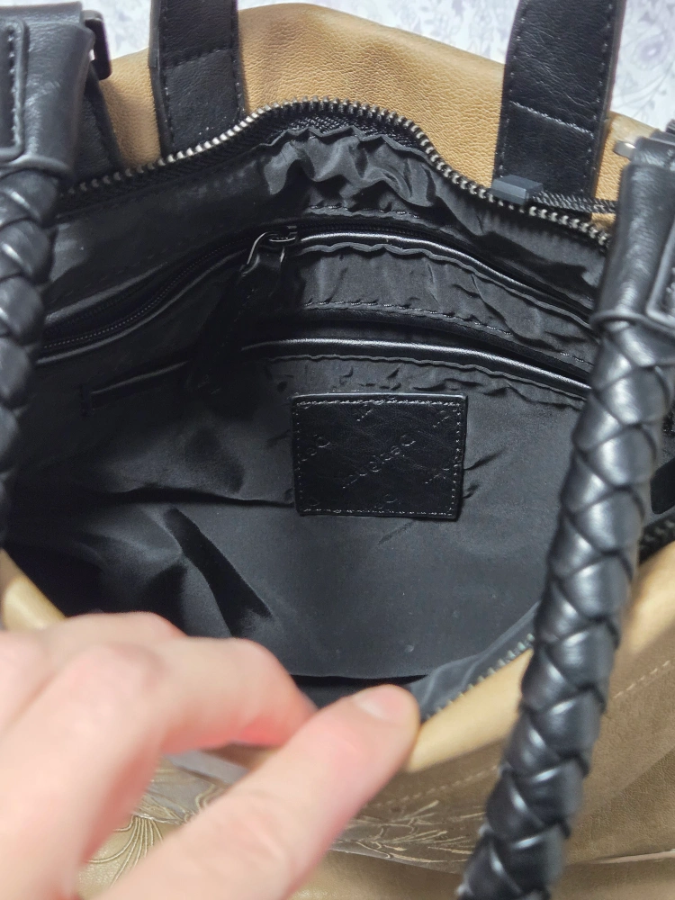 Tan coloured faux leather bag. Features embroidered floral design. Black braided handles. Multiple zippered compartments. Interior zippered pocket. Colourful drawstring accents.