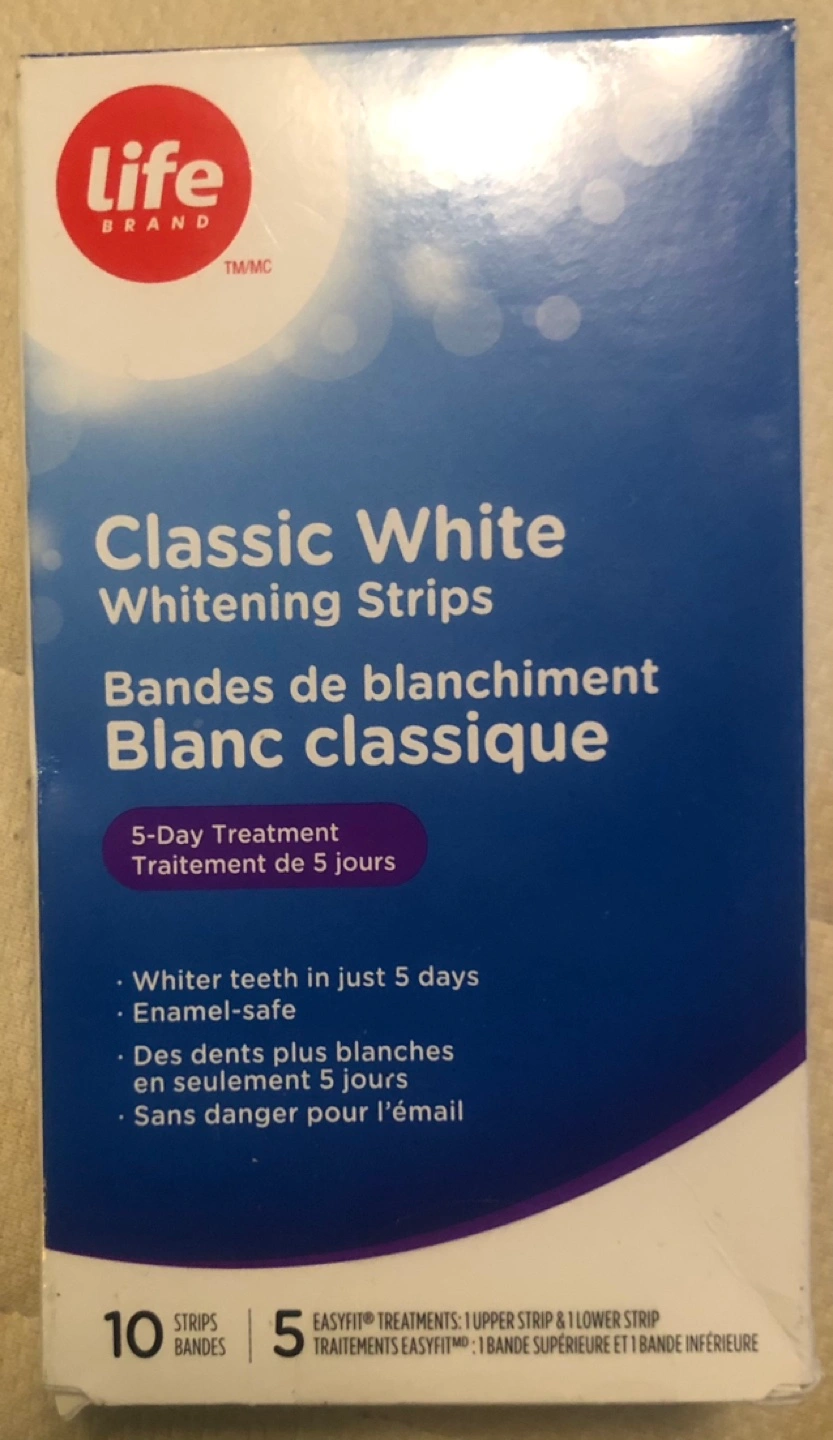 New, unopened box of Life Brand Classic White Whitening Strips. 5-day treatment, 10 strips total. Whitens teeth in 5 days. Enamel-safe. EasyFit™ application.