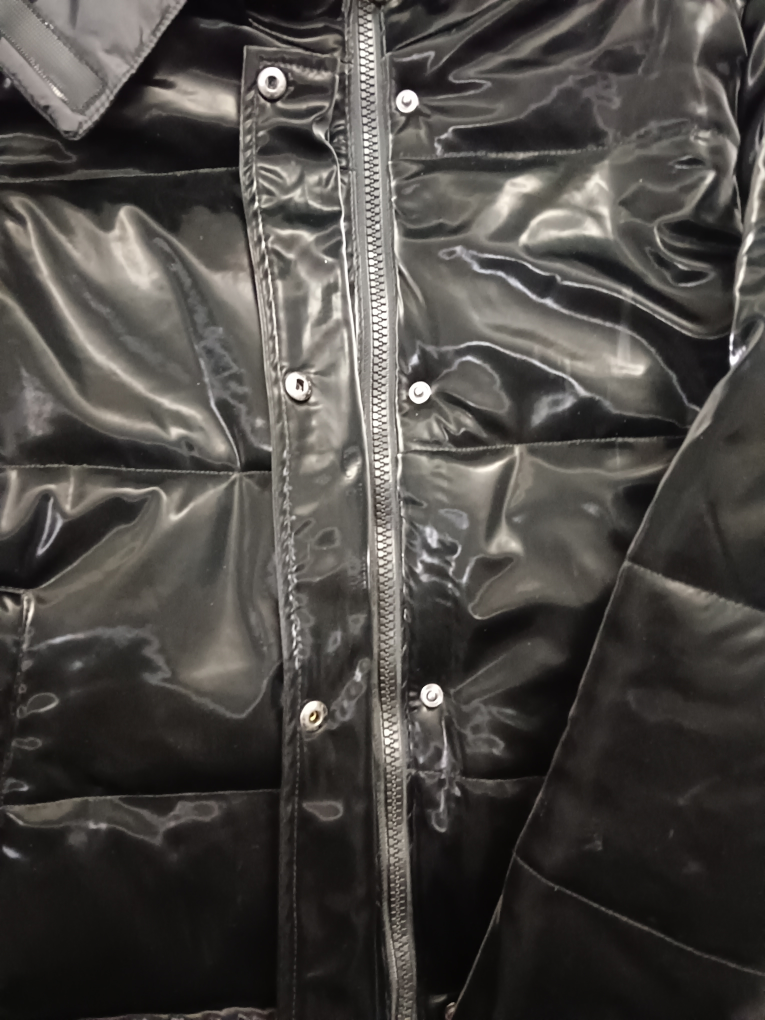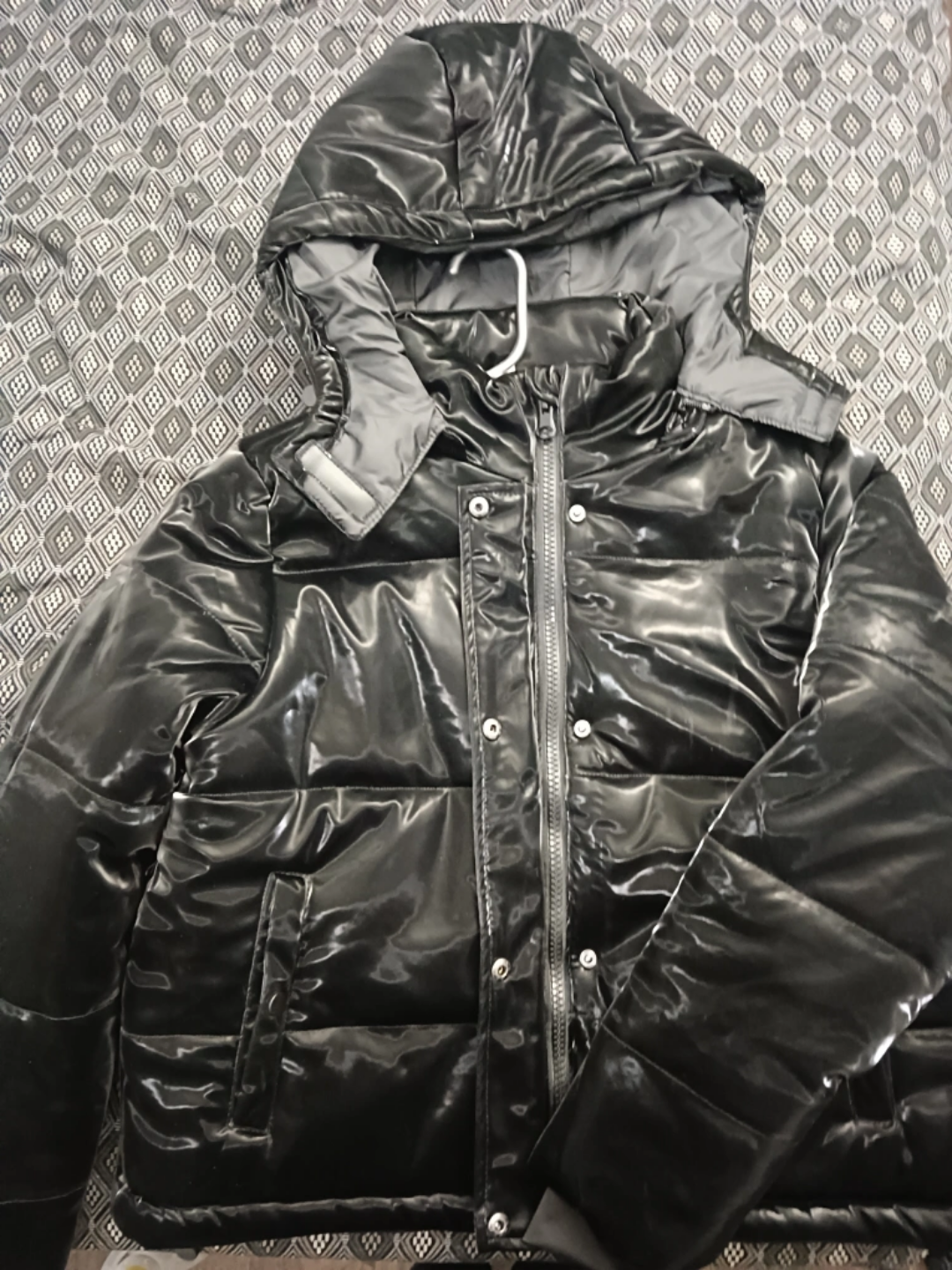 Black shiny puffer jacket. Size medium. Features a zipper and snap closure. Includes a hood. It has removable cap. I never wear it. Cash only. TY.