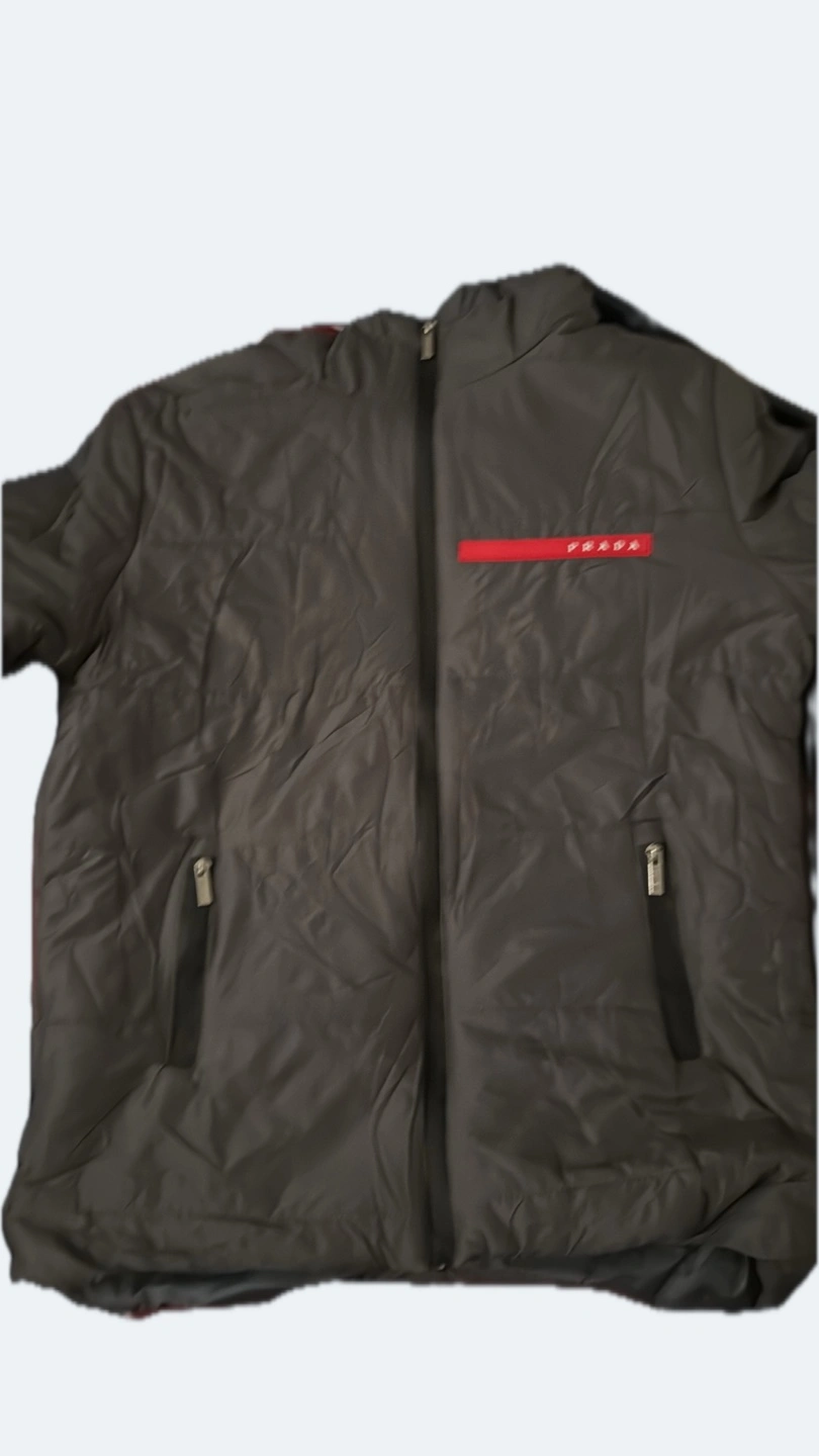 Men's dark grey Prada puffer jacket. Features a zipper closure, red accent stripe, and zippered pockets. Excellent for colder weather.