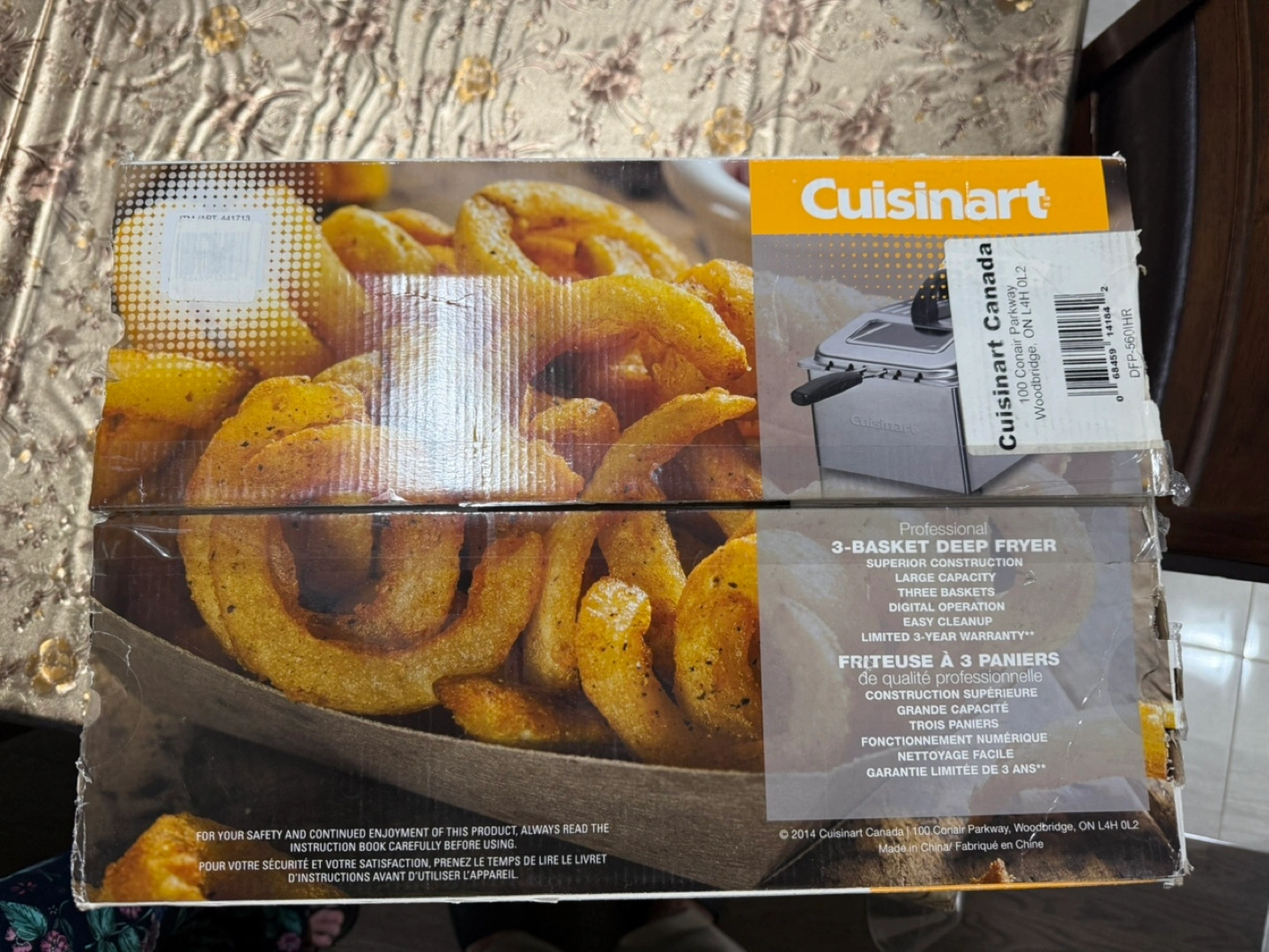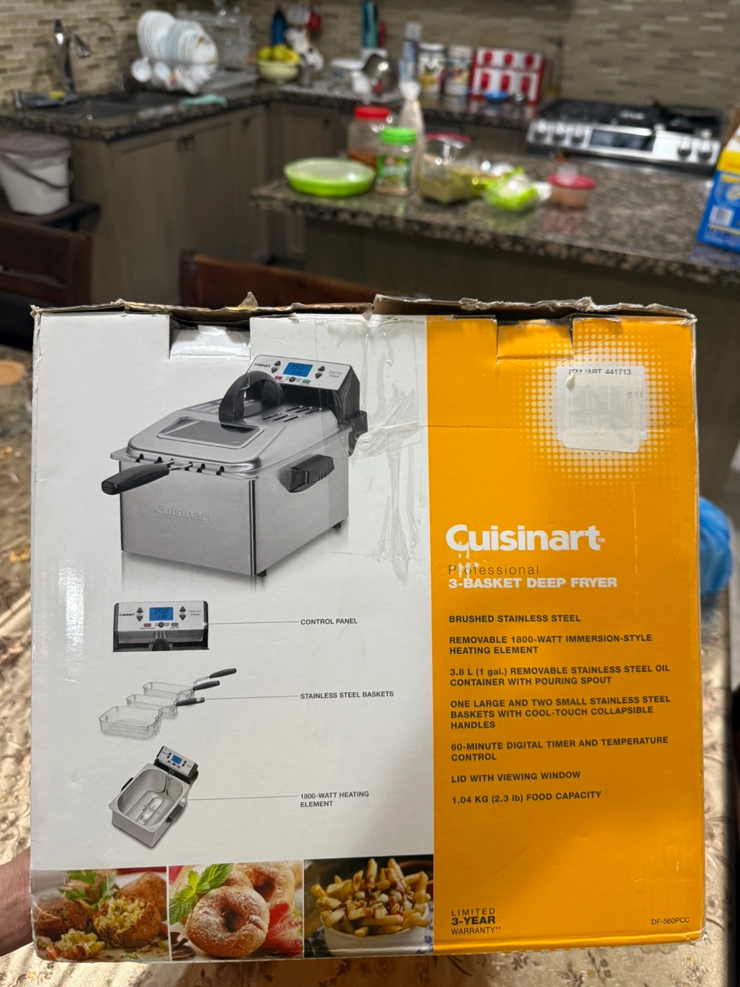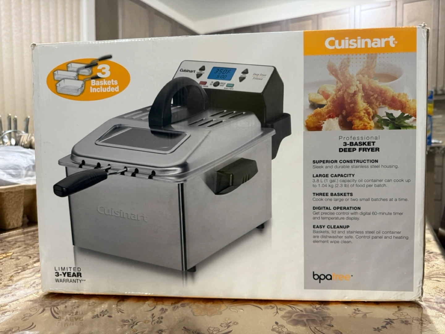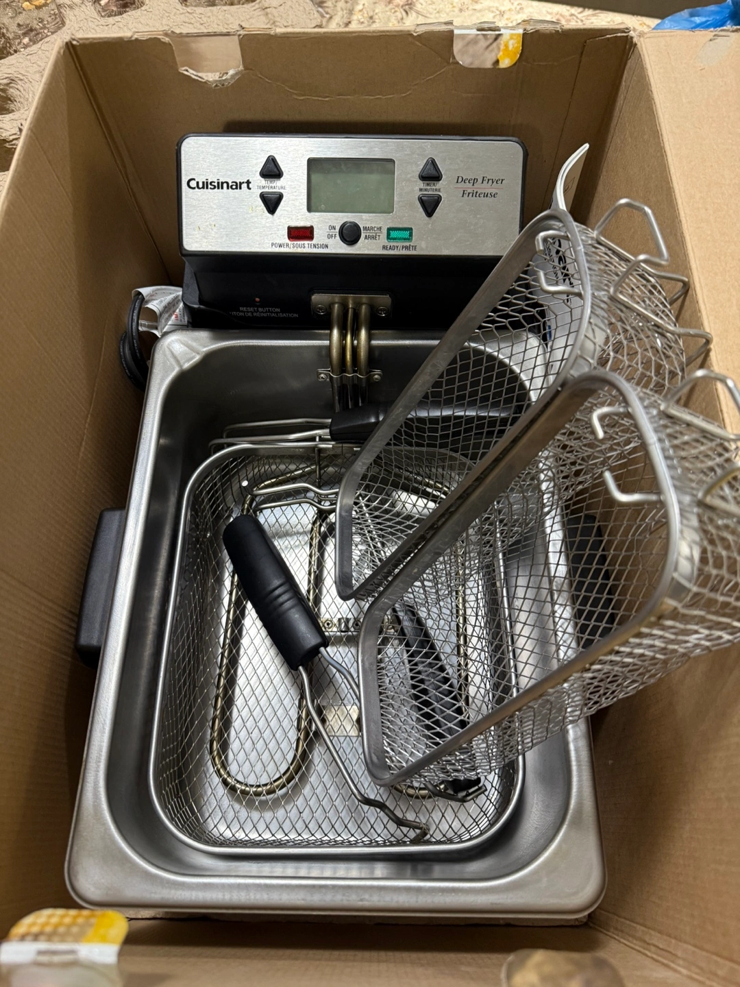 Used in box.Brushed stainless steel. 3.6 L (1 gal) removable immersion-style oil heating element. One large and two smaller stainless steel baskets with collapsible handles. Digital control with 60-minute timer and temperature display. BPA-free.