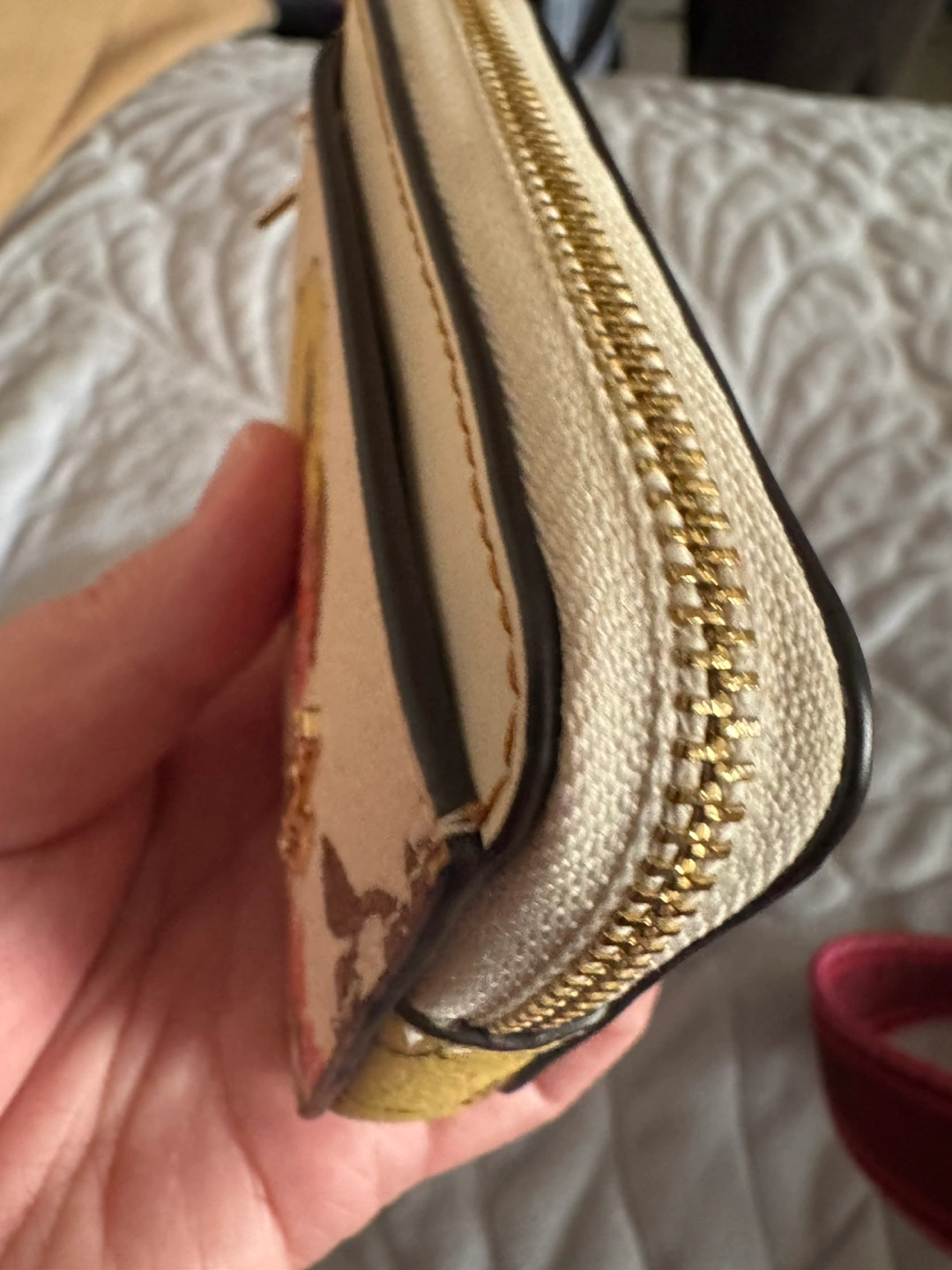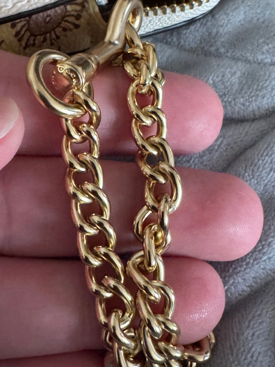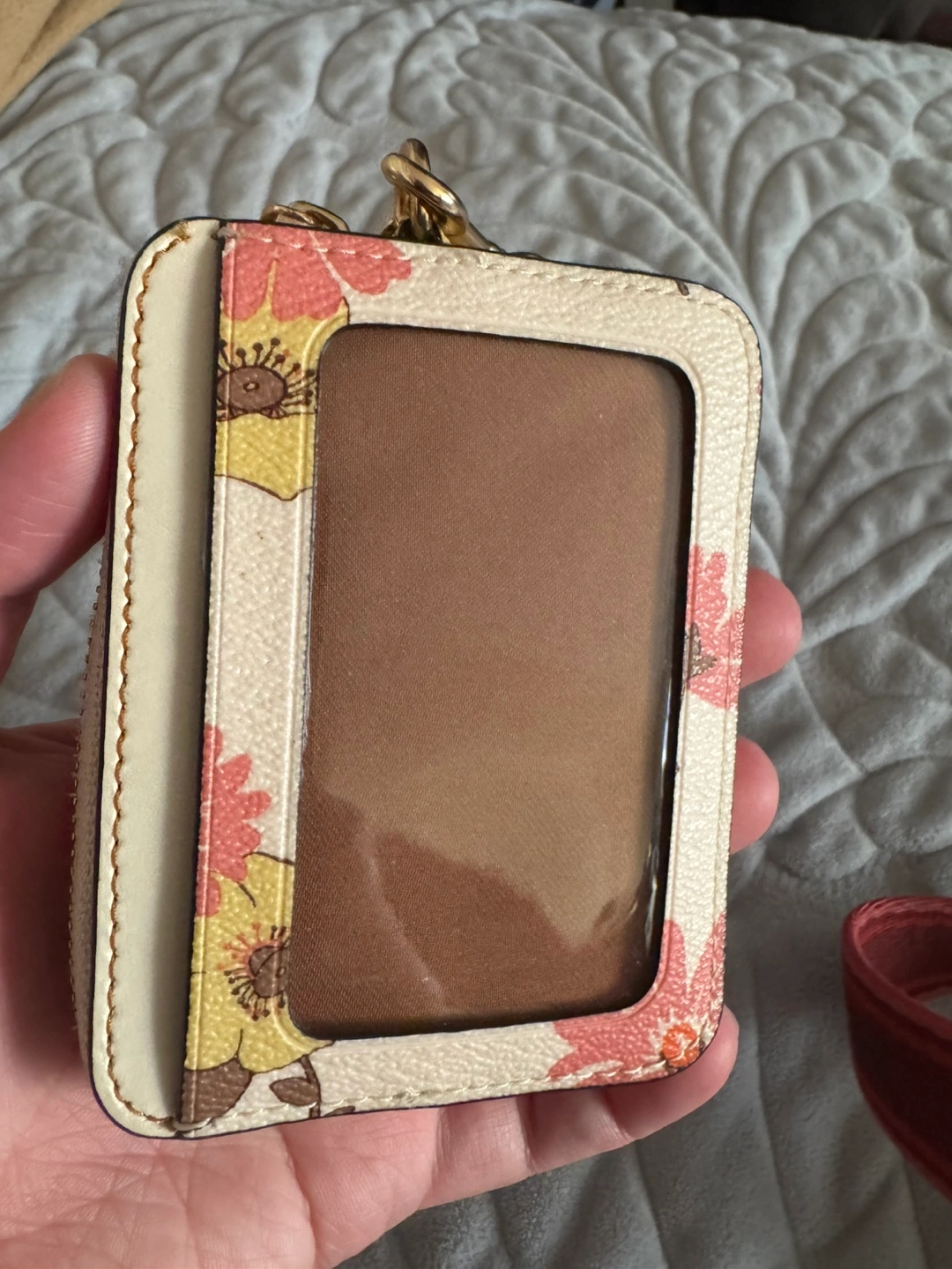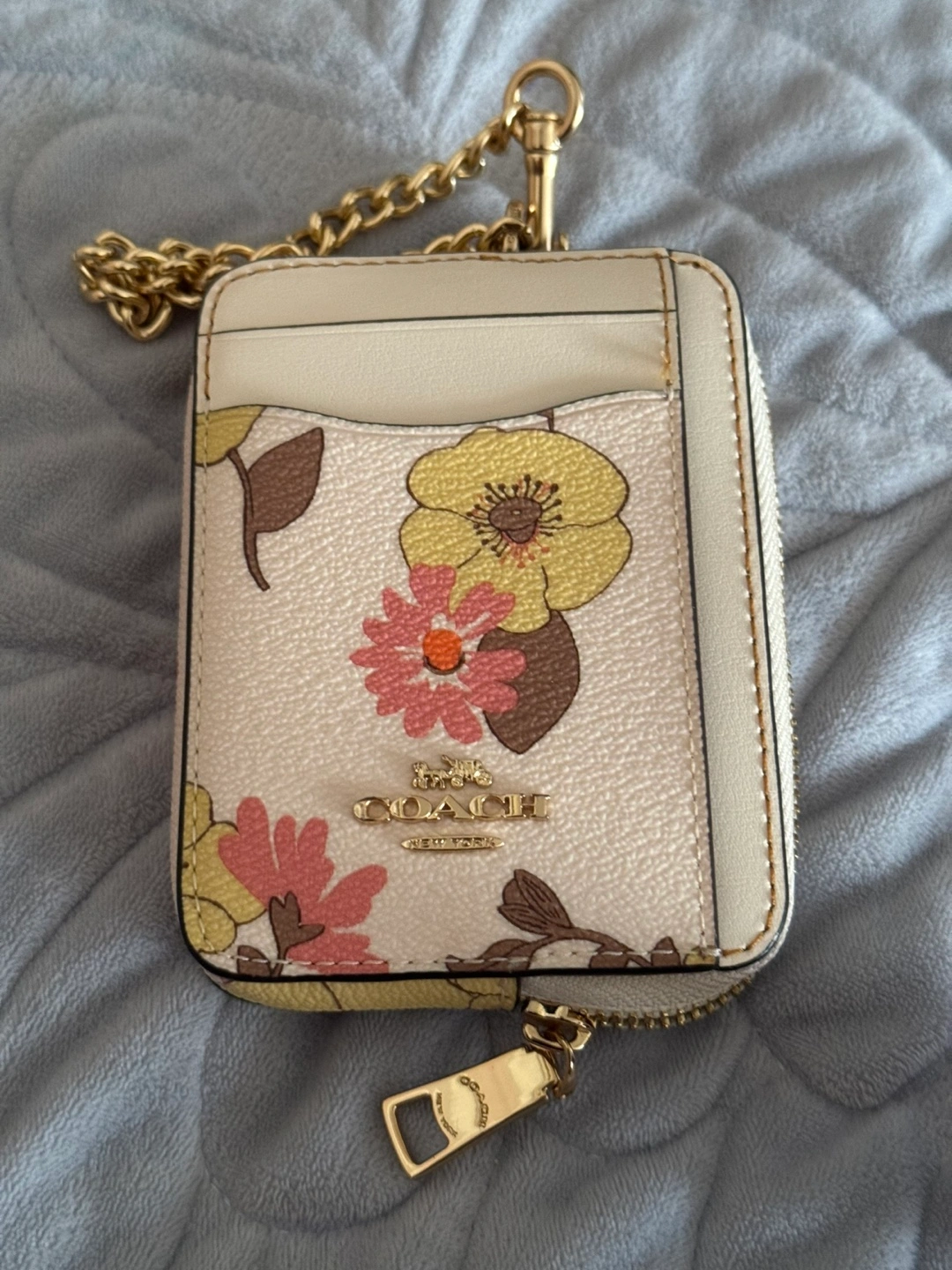 Adorable Coach card case. Features a floral print, gold-toned hardware, and a zip closure. Includes a detachable chain strap. Perfect for everyday use. In good condition pick up kerrisdale area, thank you