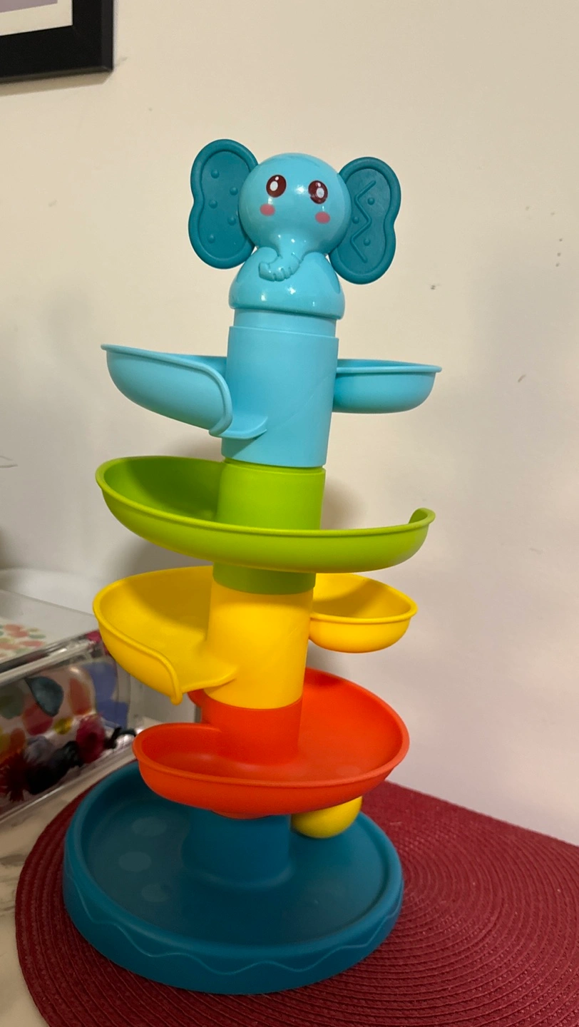 Multicoloured spiral toy. Features an elephant topper that can be a teether too and multiple levels for rolling balls. Fun for babies and toddlers.