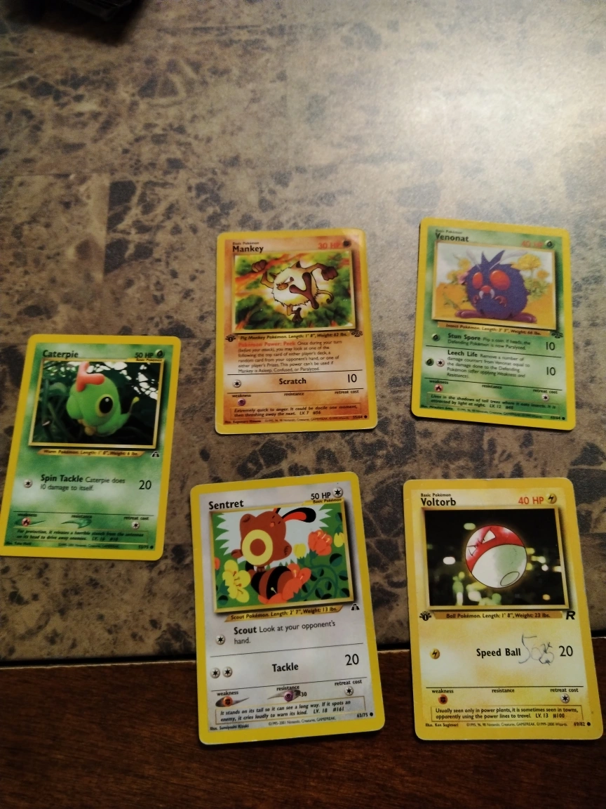 Collection of five Pokémon cards. Features Caterpie, Mankey, Venonat, Sentret, and Voltorb. Cards show some wear. all are 2001 under. $2 for the first editions and $1 for the others, $6 for all.