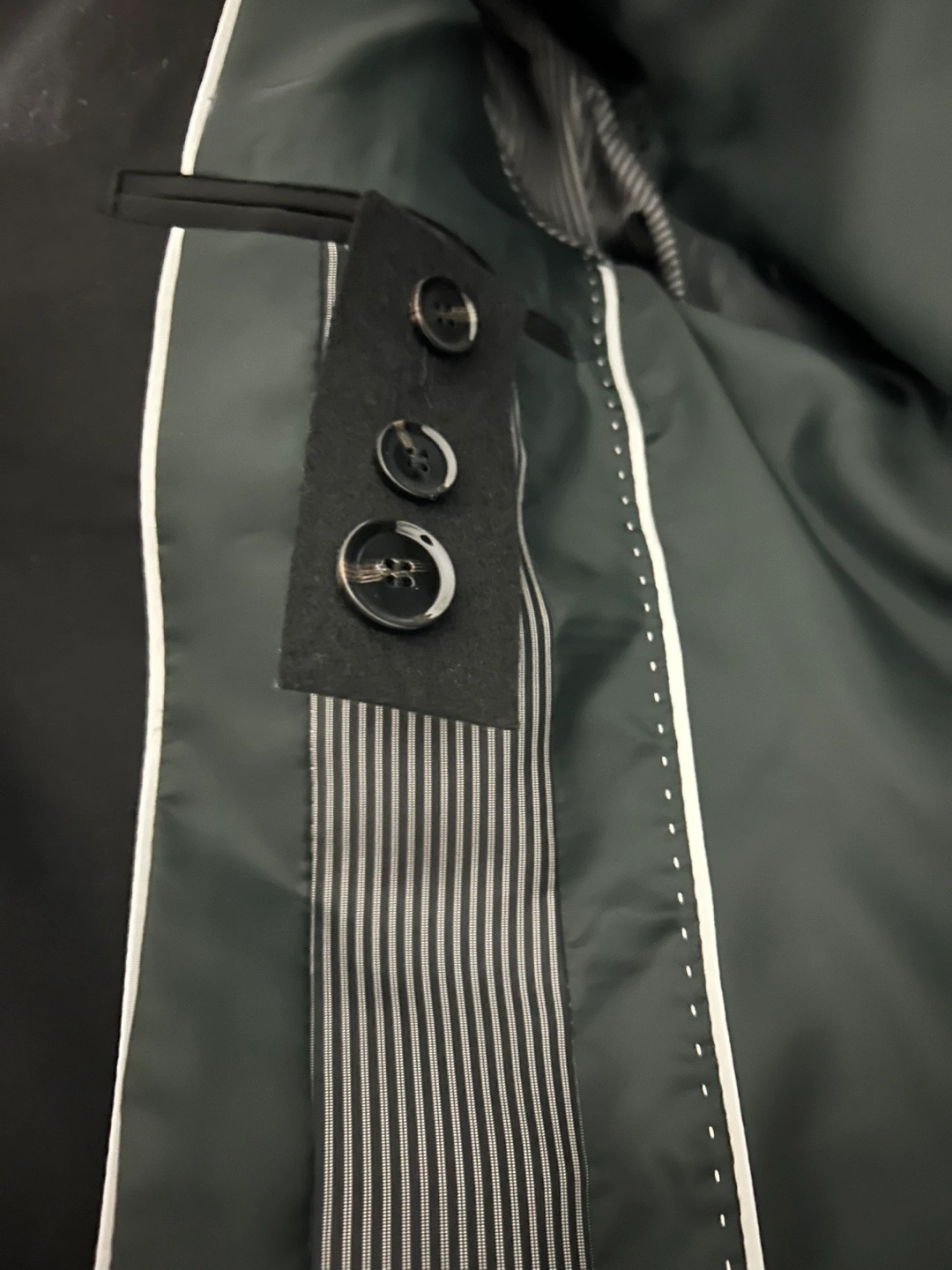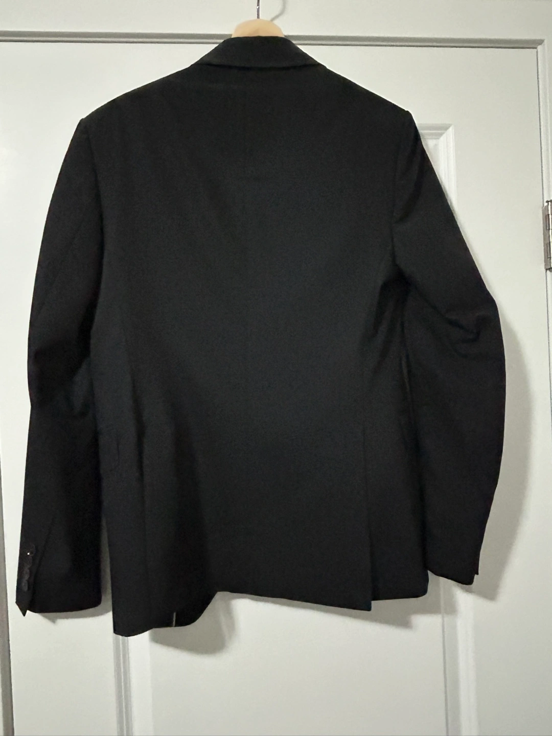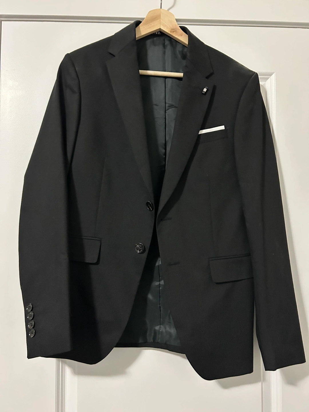 Men's black blazer. Size EUR 44, USA 34, MEX 44. Made in Turkey. Features a Cool Comfort intelligent lining. Two-button closure. Neat stitching. Single vent. Small white pocket square included.