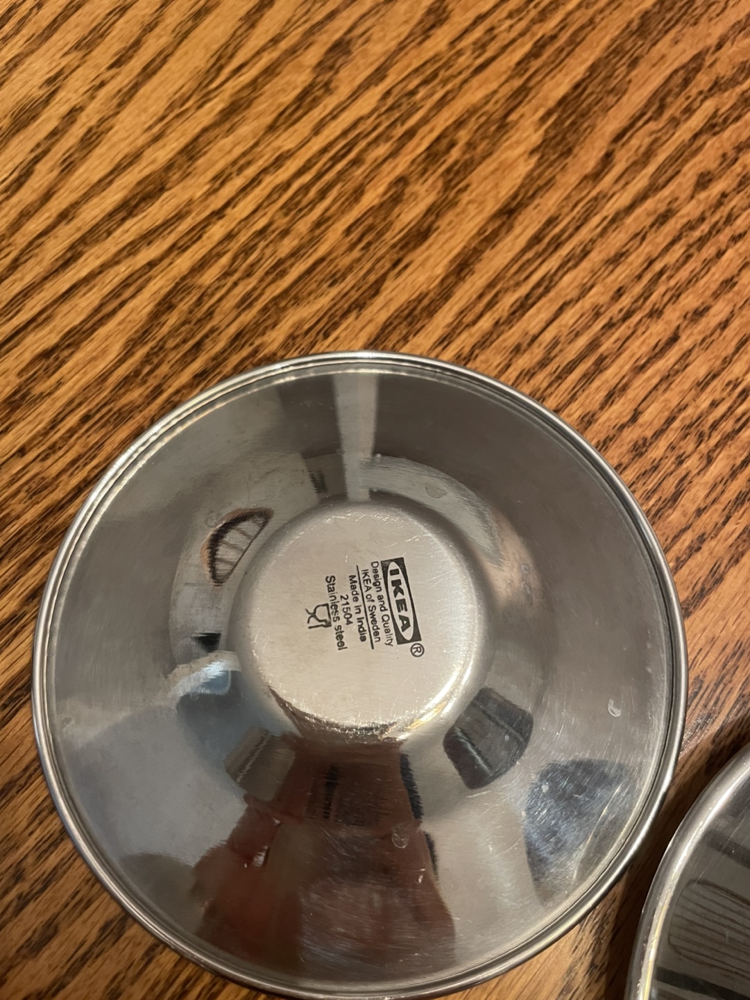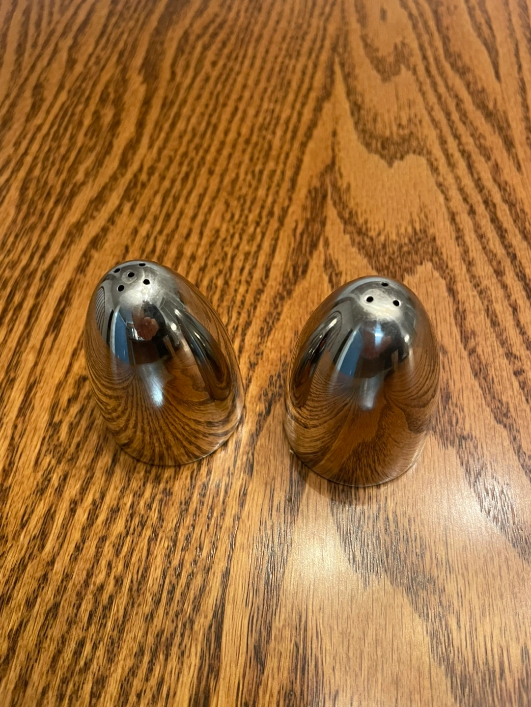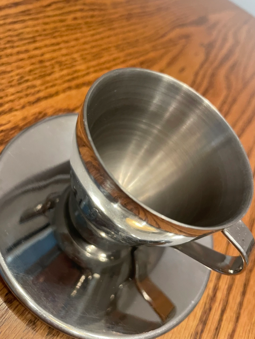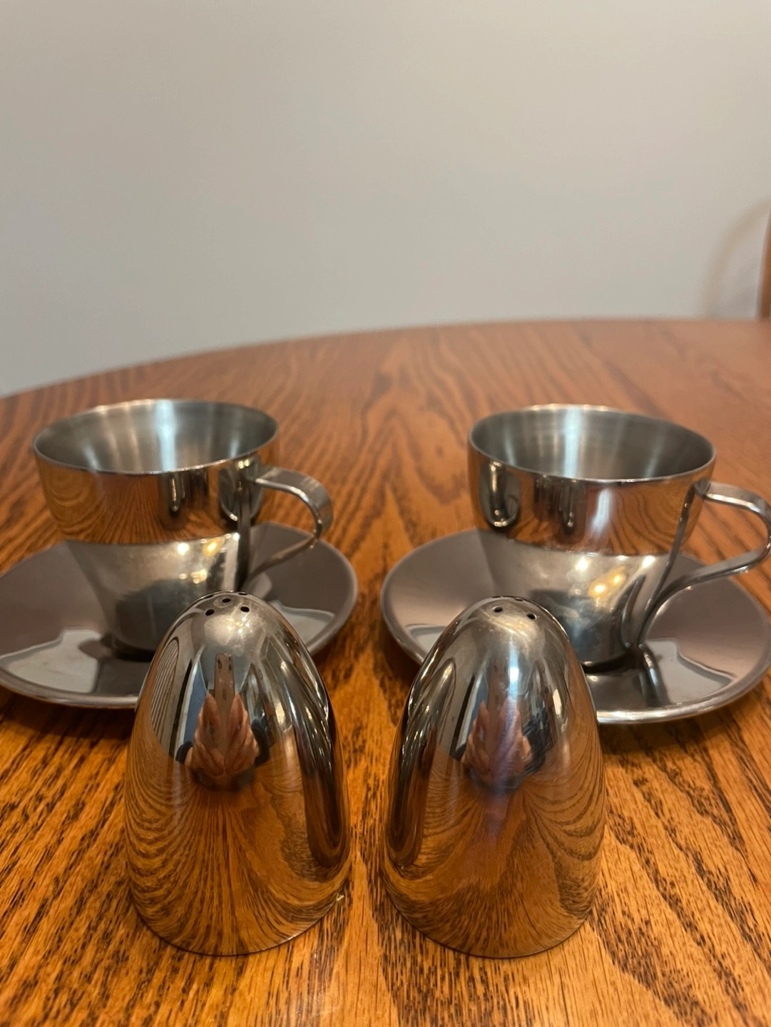 Set of two espresso cups and saucers and a matching salt and pepper shaker set. Stainless steel construction. Modern design. Great for everyday use or entertaining.